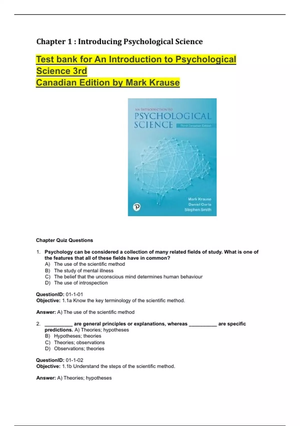 Chapter 1 : Introducing Psychological Science Test bank for An Introduction to Psychological Science 3rd Canadian Edition by Mark Krause