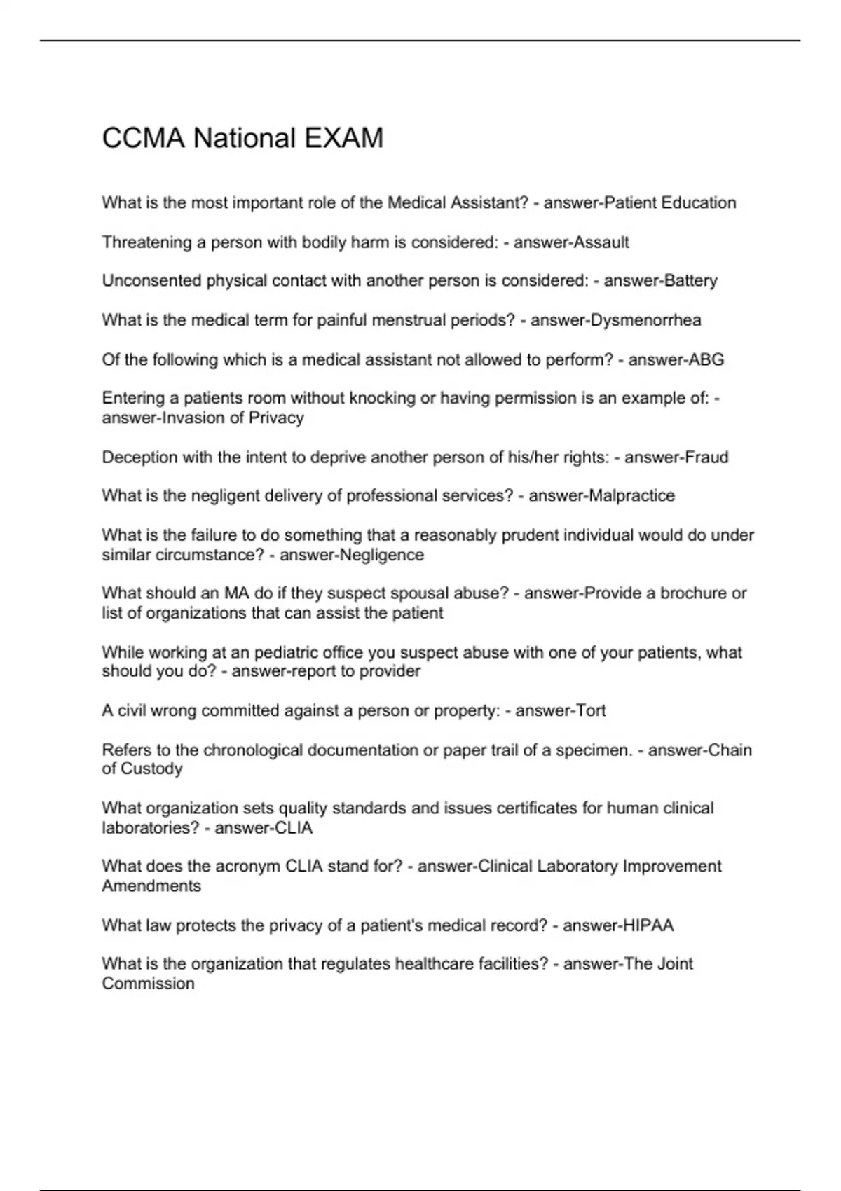 CCMA National EXAMlaboratories? - answer-CLIA What does the acronym CLIA stand for? - answer-Clinical Laboratory Improvement Amendments What law protects the privacy of a patient's medical record? - answer-HIPAA What is the organization that regulates healthcare facilities? - answer-The Joint Commission What does OSHA stand for? - answer-Occupational Safety and Health Administration What federal agency overseas and regulates safety in the work place and provides training without cost? - answer-OSHA What is the most important component of patient safety? - answer-Correctly identifying the patient A patient extending his/her arm for phlebotomy or undressing for a physical exam is considered: - answer-Implied Consent Explaining to the patient the risks, benefits, possible outcomes and alternative therapies is a form of: - answer-Informed Consent Obtaining a patient's signature to perform a procedure is called: - answer-Written Consent A list of guarantees for those receiving medical care, including fair treatment and autonomy over medical decisions: - answer-Patients' Bill of Rights What does POMR stand for? - answer-Problem Oriented Medical Record Which record should always be filed in chronological order? - answer-POMR The information contained within the medical record belongs to: - answer-The patient Who owns the physical form containing the patient's information? - answer-the author or provider What does CMS stand for? - answer-Centers for Medicare and Medicaid Services