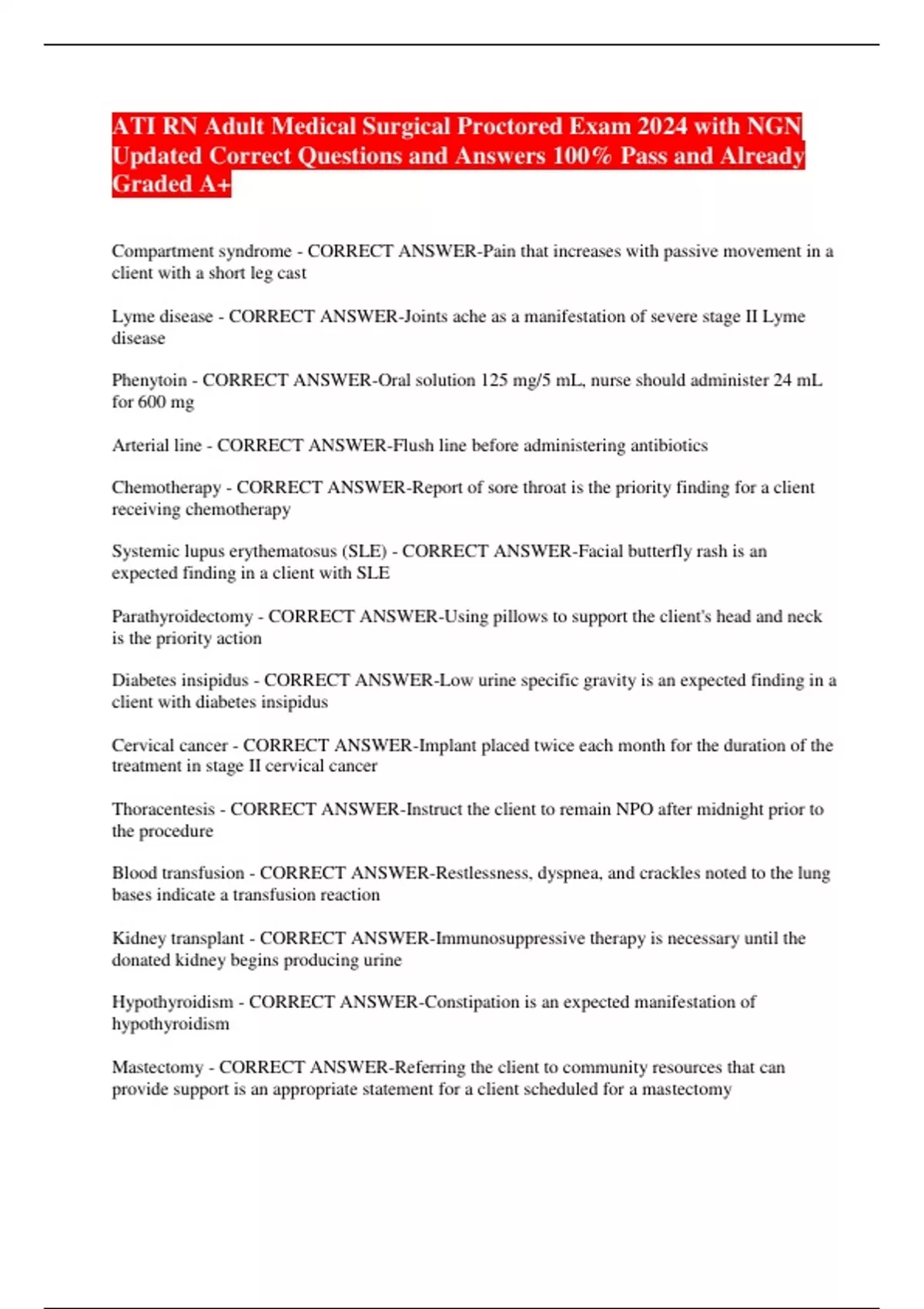 ATI RN Adult Medical Surgical Proctored Exam 2024 with NGN Updated Correct Questions and Answers 100% Pass and Already Graded A+ Compartment syndrome - CORRECT ANSWER-Pain that increases with passive movement in a client with a short leg cast Lyme disease - CORRECT ANSWER-Joints ache as a manifestation of severe stage II Lyme disease Phenytoin - CORRECT ANSWER-Oral solution 125 mg/5 mL, nurse should administer 24 mL for 600 mg Arterial line - CORRECT ANSWER-Flush line before administering antibiotics Chemotherapy - CORRECT ANSWER-Report of sore throat is the priority finding for a client receiving chemotherapy Systemic lupus erythematosus (SLE) - CORRECT ANSWER-Facial butterfly rash is an expected finding in a client with SLE Parathyroidectomy - CORRECT ANSWER-Using pillows to support the client's head and neck is the priority action Diabetes insipidus - CORRECT ANSWER-Low urine specific gravity is an expected finding in a client with diabetes insipidus Cervical cancer - CORRECT ANSWER-Implant placed twice each month for the duration of the treatment in stage II cervical cancer Thoracentesis - CORRECT ANSWER-Instruct the client to remain NPO after midnight prior to the procedure Blood transfusion - CORRECT ANSWER-Restlessness, dyspnea, and crackles noted to the lung bases indicate a transfusion reaction Kidney transplant - CORRECT ANSWER-Immunosuppressive therapy is necessary until the donated kidney begins producing urine Hypothyroidism - CORRECT ANSWER-Constipation is an expected manifestation of hypothyroidism Mastectomy - CORRECT ANSWER-Referring the client to community resources that can provide support is an appropriate statement for a client scheduled for a mastectomy Nephrostomy tube - CORRECT ANSWER-The client reporting back pain is an indication of a complication and should be reported to the provider Alzheimer's disease - CORRECT ANSWER-Position tabletop clocks with multi-colored backgrounds throughout the home for a client with Alzheimer's disease Cancer pain - CORRECT ANSWER-Speaking to the provider about incorporating acupuncture into the treatment plan is an appropriate response for a client with cancer pain Extubation - CORRECT ANSWER-Stridor is an indication of airway obstruction and should be reported to the provider immediately Myocardial infarction (MI) - CORRECT ANSWER-Creatine kinase (CK-MB) 85 mg/dL is an indication of a myocardial infarction Blood transfusion - CORRECT ANSWER-Checking for the type and number of units of blood to administer is the first action before initiating a blood transfusion Aplastic anemia - CORRECT ANSWER-WBC count 2,000/mm^3 indicates a potential complication in a client with aplastic anemia Modified radical mastectomy - CORRECT ANSWER-Flex the affected arm when ambulating is an appropriate instruction for a client following a modified radical mastectomy Atherosclerosis prevention - CORRECT ANSWER-Follow a smoking cessation program, maintain an appropriate weight, and eat a low-fat diet are recommendations for preventing atherosclerosis Hemianopsia - CORRECT ANSWER-Scan the environment by turning your head from side to side to reduce the risk of falls for a client with homonymous hemianopsia Lung re-expansion - CORRECT ANSWER-Bubbling in the water seal chamber ceasing is an indication of lung re-expansion Heparin administration - CORRECT ANSWER-Gently massaging the site after injecting the medication is an appropriate action for a client self-administering heparin Osteomyelitis - CORRECT ANSWER-Sedimentation rate is a potential complication and should be reported to the provider for a client with osteomyelitis Latex allergy - CORRECT ANSWER-Avocados can indicate a latex allergy DKA improvement - CORRECT ANSWER-pH 7.28 indicates improvement in a client with diabetic ketoacidosis (DKA)