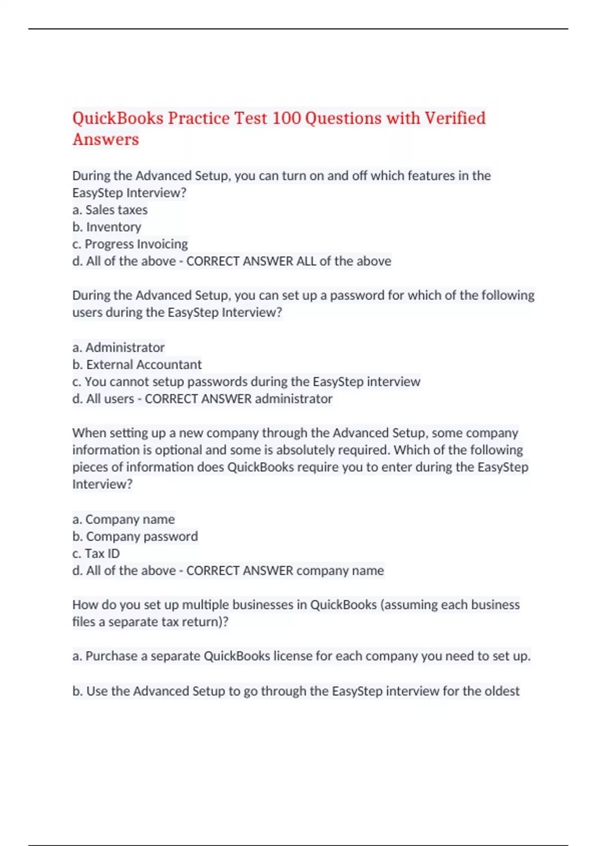 QuickBooks Practice Test 100 Questions with Verified Answers During the Advanced Setup, you can turn on and off which features in the EasyStep Interview? a. Sales taxes b. Inventory c. Progress Invoicing d. All of the above - CORRECT ANSWER ALL of the above During the Advanced Setup, you can set up a password for which of the following users during the EasyStep Interview? a. Administrator b. External Accountant c. You cannot setup passwords during the EasyStep interview d. All users - CORRECT ANSWER administrator When setting up a new company through the Advanced Setup, some company information is optional and some is absolutely required. Which of the following pieces of information does QuickBooks require you to enter during the EasyStep Interview? a. Company name b. Company password c. Tax ID d. All of the above - CORRECT ANSWER company name How do you set up multiple businesses in QuickBooks (assuming each business files a separate tax return)? a. Purchase a separate QuickBooks license for each company you need to set up. b. Use the Advanced Setup to go through the EasyStep interview for the oldest c. Use the Advanced Setup to go through the EasyStep interview for each company d. Use the Advanced Setup to go through the EasyStep Interview for the largest company first, and then choose File Add a separate business at the end of the interview. to create a separate company file. - CORRECT ANSWER Use the Advanced Setup to go through the EasyStep interview for each company During the Advanced Setup, how do you setup a new account that is not on the default list of accounts during the EasyStep Interview? a. You can't add accounts that are not on the QuickBooks default list. Finish the interview and add the accounts directly to the Chart of Accounts. b. Click Add new account in the EasyStep Interview. c. Click Edit Account during the EasyStep Interview. d. Select Import My Chart of Accounts during the EasyStep Interview. - CORRECT ANSWER You can't add accounts that are not on the QuickBooks default list. Finish the interview and add the accounts directly to the Chart of Accounts. You've been hired by a company that started in 1911. They've never used QuickBooks. During the Advanced Setup, what "Start Date" should you use in the EasyStep Interview? a. There is no Start Date in the EasyStep Interview. b. The date the company bought QuickBooks. c. 1911 d. The date you want to begin tracking the company's finances in QuickBooks. - CORRECT ANSWER The date you want to begin tracking the company's finances in QuickBooks. How do you restore a company file from a backup copy? a. Choose File Back Up. Then click the Restore from Backup button. b. Choose File Utilities File Operations Restore. c. Choose File Open or Restore Company. Select Restore a backup copy and click Next. Choose Local or Online Backup and click Next. Select the file to restore and click Open. Choose where to restore the file to and click Save. d. Click the Restore icon on the Home page. click Next. - CORRECT ANSWER Choose File Open or Restore Company. Select Restore a backup copy and click Next. Choose Local or Online Backup and click Next. Select the file to restore and click Open. Choose where to restore the file to and click Save. Which of the following is NOT a backup option in QuickBooks? a. Manually back up the file. b. Automatically back up the data file when closing QuickBooks. c. Schedule an unattended backup d. All of the above are QuickBooks backup options. - CORRECT ANSWER All of the above are QuickBooks backup options. Why would you restore a data file from the backup file? a. You wish to review the company data as it stood at an earlier date. b. The company data file on your hard drive is damaged and cannot be used. c. Your computer crashed. You reloaded QuickBooks, and now you are ready to open the company file. d. All of the above. - CORRECT ANSWER All of the above How do you switch to Multi-User Mode? a. Choose Company Set Up Users and Passwords Set Up Users from the b. Open the data file from a remote location. c. Choose Edit Preferences Multi-User from the menu. d. Choose File Switch to Multi-user Mode from the menu. - CORRECT ANSWER Choose File Switch to Multi-user Mode from the menu. If you choose to remove transactions as of a specific date from the "Condense Data" window, what does QuickBooks do? a. Removes all payroll transactions that occurred on that date. This is a great way to fix the mistakes a new person made on a particular day. b. Removes all transactions while leaving lists, preferences, and service subscriptions intact. c. Changes the company's start date. d. Deletes all transactions, as well as user passwords and access privileges. - CORRECT ANSWER Removes all transactions while leaving lists, preferences, and service subscriptions intact. What happens when you press F2 in QuickBooks? a. Nothing, because function keys are not designed to work with QuickBooks. b. QuickBooks opens the Help. c. QuickBooks opens the Product Information window which includes version and company file information. d. QuickBooks closes all windows. - CORRECT ANSWER QuickBooks opens the Product Information window which includes version and company file information. When would you enter a journal entry? a. To correct errors (if you have a strong accounting background) b. For year-end adjustments c. To enter depreciation d. All of the above - CORRECT ANSWER All of the above If the computer that houses your QuickBooks data crashes, what should you do? a. Restore a back up copy of your company file b. Create a back up copy of your company file c. Condense your company file data d. Export your data to Excel - CORRECT ANSWER Restore a back up copy of your company file When you start a company or are hired as a bookkeeper, it is important to know which edition of QuickBooks you are using. What are the major QuickBooks editions? a. QuickBooks Online, QuickBooks Pro, QuickBooks Premier, QuickBooks Enterprise Solutions b. QuickBooks