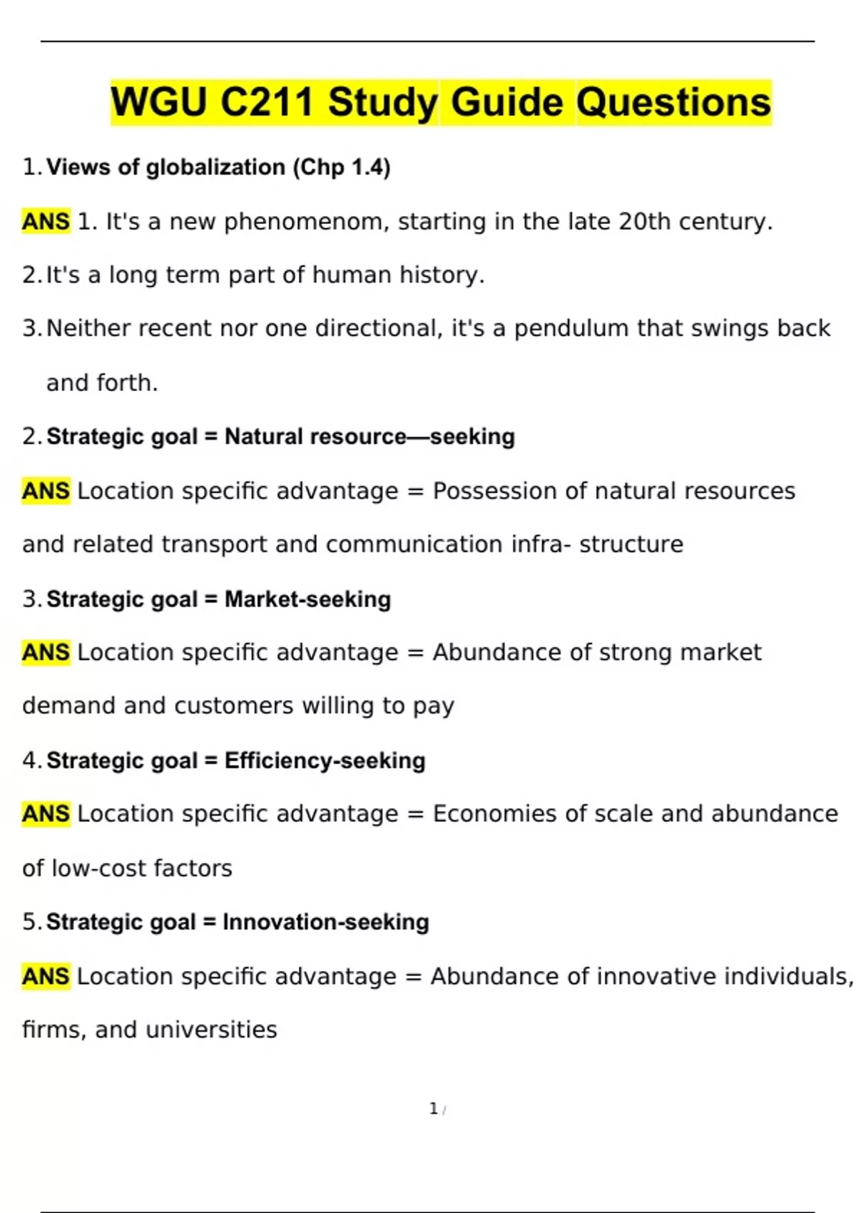 1. Views of globalization (Chp 1.4) ANS 1. It's a new phenomenom, starting in the late 20th century. 2. It's a long term part of human history. 3. Neither recent nor one directional, it's a pendulum that swings back and forth. 2. Strategic goal = Natural resource—seeking ANS Location specific advantage = Possession of natural resources and related transport and communication infra- structure 3. Strategic goal = Market-seeking ANS Location specific advantage = Abundance of strong market demand and customers willing to pay 4. Strategic goal = Efficiency-seeking ANS Location specific advantage = Economies of scale and abundance of low-cost factors 5. Strategic goal = Innovation-seeking ANS Location specific advantage = Abundance of innovative individuals, firms, and universities
