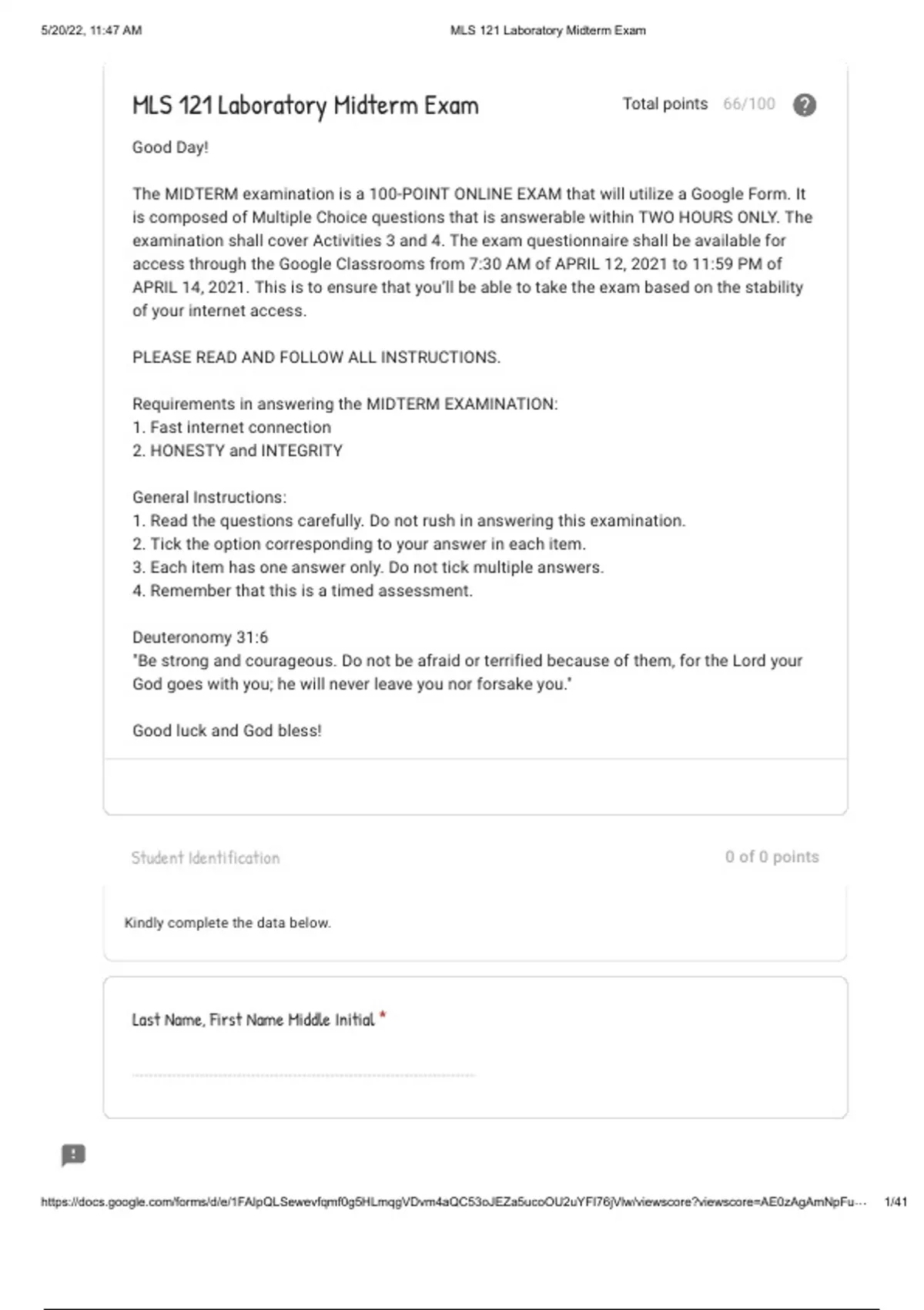 MLS 121 Laboratory Midterm Exam Questions & answers | Best For 2024 Exam 5/20/22, 11:47 AM MLS 121 Laboratory Midterm Exam Student Identification 0 of 0 points Kindly complete the data below. MLS 121 Laboratory Midterm Exam Total points 66/100 Good Day! The MIDTERM examination is a 100-POINT ONLINE EXAM that will utilize a Google Form. It is composed of Multiple Choice questions that is answerable within TWO HOURS ONLY. The examination shall cover Activities 3 and 4. The exam questionnaire shall be available for access through the Google Classrooms from 7:30 AM of APRIL 12, 2021 to 11:59 PM of APRIL 14, 2021. This is to ensure that you’ll be able to take the exam based on the stability of your internet access. PLEASE READ AND FOLLOW ALL INSTRUCTIONS. Requirements in answering the MIDTERM EXAMINATION: 1. Fast internet connection 2. HONESTY and INTEGRITY General Instructions: 1. Read the questions carefully. Do not rush in answering this examination. 2. Tick the option corresponding to your answer in each item. 3. Each item has one answer only. Do not tick multiple answers. 4. Remember that this is a timed assessment. Deuteronomy 31:6 "Be strong and courageous. Do not be afraid or terrified because of them, for the Lord your God goes with you; he will never leave you nor forsake you." Good luck and God bless! Last Name, First Name Middle Initial * 5/20/22, 11:47 AM MLS 121 Laboratory Midterm Exam Start of Examination 0 of 0 points Input the Time and Date started. Time MM DD YYYY Examination Proper 66 of 100 points INSTRUCTIONS: Choose the letter of the CORRECT answer for each item. Some items are worth 2 points. Class Code * Time Started * Date Started * 5/20/22, 11:47 AM MLS 121 Laboratory Midterm Exam 1/1 A. 1.42 moles of sulfur B. 0.70 moles of sulfur C. 2.13 moles of sulfur D. 1 mole of sulfur 0/1 A. 92.28 g B. 185 g C. 32.31 g D. none of these 1. How many moles of sulfur will you need to react with 1.42 moles of iron? Given the following chemical equation for thereaction: Fe (s) + S (s) → Fe 2 S 3 (s) * 2. Welding is a procedure commonly performed in building construction. It involves the use of acetylene gas to fuse metals together. Using the chemical equation below, how many grams of carbon dioxide will be produced after burning 0.0546 grams of acetylene? C2H2 (g) + O2 (g) → CO2 (g) + H2O (g) Given: acetylene= 26.04 g/mol, O=16 g/mol, CO2= 44.01 g/mol, H2O= 18.02 g/mol * 5/20/22, 11:47 AM MLS 121 Laboratory Midterm Exam 1/1 A. 7.20 g B. 79.07 g C. 79.2 g D. 0.0791 g 1/1 A. 1.0 g B. 6.0 g C. 0.03 g D. 0.6 g 1/1 A. 1.83 g B. 1.84 g C. 0.92 g D. 4.74 x 10 -4 g 3. What is the mass (in grams) of oxygen that is needed to react with 22.5 g of C7H16? Given the following:C7H16 (g)+ 11 O2 (g) → 7CO2 (g) + 8 H2O (g) C= 12 g/mol, H= 1 g/mol, O=16 g/mol * 4. How much water (in grams) will be produced if 1 g of glucose is involved in a combustion reaction? Given the following:C6H12O6 + O2 → CO2 + H2O C= 12 g/mol, H= 1 g/mol, O=16 g/mol * 5. How much CO2 (in grams) will be absorbed by each 1.0 g of LiOH? Given the following:LiOH + CO2 → Li2CO3 + H2O Li= 6.94 g/mol, O=16 g/mol. H=1.01 g/mol, C= 12.01 g/mol * 5/20/22, 11:47 AM MLS 121 Laboratory Midterm Exam 1/1 A. 2 Al + 3 Cl2 → 2AlCl3 B. HCl + NH3 → NH4Cl C. PCl3 (l) + Cl2 (g) → PCl5 (s) D. S (s) + O2 (g) → SO3 (g) 1/1 A. SO3 (g) + H2O (l) → H2SO4 (aq) B. Sb2S3 + HCl (aq) → SbCl3 (aq) + H2S (g) C. 2 N2 + 3 O2 → 2N2O3 D. N2 + O2 → 2NO 1/1 A. 2, 3, 6, 6 B. 1, 6, 2, 3 C. 3, 1, 1, 2 D. 3, 2, 2, 3 6. Which of the following chemical equations are not balanced? * 7. Which of the following chemical equations are not balanced? * 8. What is the correct combination of coefficients that will balance the following chemical equation? Fe2S3 (s) + HCl (aq) → FeCl3 (aq) + H2S (g) * 5/20/22, 11:47 AM MLS 121 Laboratory Midterm Exam 1/1 A. NaPO4 (aq) + MgCl (aq) → MgPO4 (s) + NaCl (aq) B. Na3PO4 (aq) + MgCl2 (aq) → Mg3(PO4)2 (s) + NaCl (aq) C. 2 NaPO4 (aq) +4 MgCl (aq) → 2MgPO4 (s) + 4NaCl (aq) D. 2 Na3PO4 (aq) + 3 MgCl2 (aq) → Mg3(PO4)2 (s) + 6 NaCl (aq) 1/1 A. unbalanced equation; synthesis reaction B. balanced equation; single replacement reaction C. balanced equation; combustion reaction D. balanced reaction; hydrolytic reaction 0/1 A. It has the value 6.02x1026 B. It denotes the number of molecules in 1 mole of any molecular compound. C. It is the mass, in grams, of 1 mole of any substance. D. It denotes the number of atoms in 1 mole of any substance. 9. Sodium phosphate was made to react with Magnesium chloride in order to form Magnesium phosphate and Sodium chloride. What is the correct chemical equation that represents this reaction? * 10. Which of the following options correctly describes the chemical equation? CH4 + 2O2 → CO2 + 2H2O * 11. Which statement concerning Avogadro’s number is correct? * 5/20/22, 11:47 AM MLS 121 Laboratory Midterm Exam 1/1 A. Chemical formula and Avogadro’s number B. Chemical formula and atomic masses C. Atomic masses and Avogadro’s number D. Atomic numbers and Avogadro’s number 1/1 A. 1, 2, 3 B. 2, 1, 3 C. 3, 1, 2 D. 1, 1, 3 1/1 A. 1,6,2,5 B. 1,6,6,1 C. 1,6,6,6 D. 6,6,6,2 12. Which set of quantities is needed to calculate the mass of 1 mole of a substance? * 13. When the chemical equation _____NH3