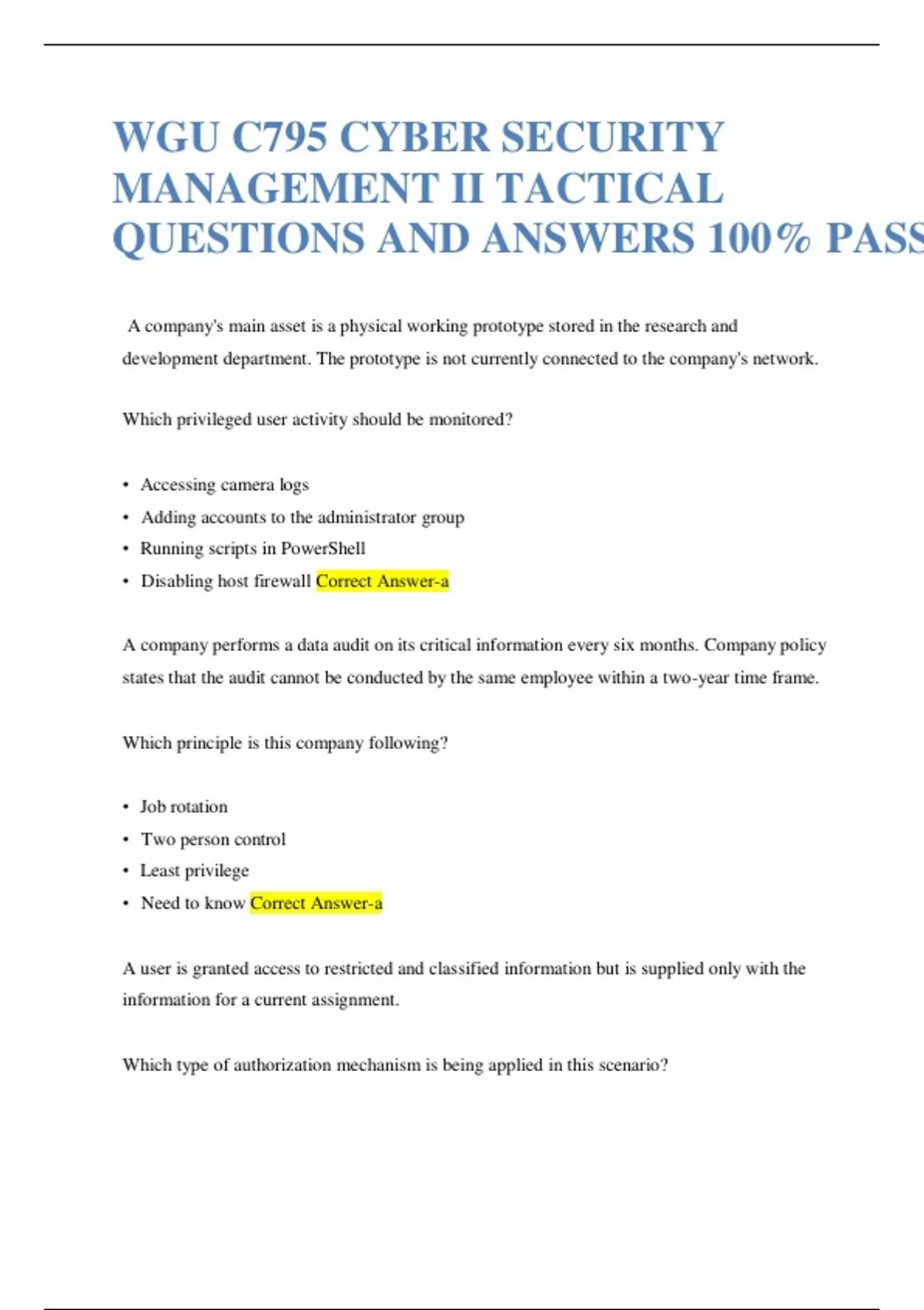 WGU C795 CYBER SECURITY MANAGEMENT II TACTICAL QUESTIONS AND ANSWERS 100% PASS