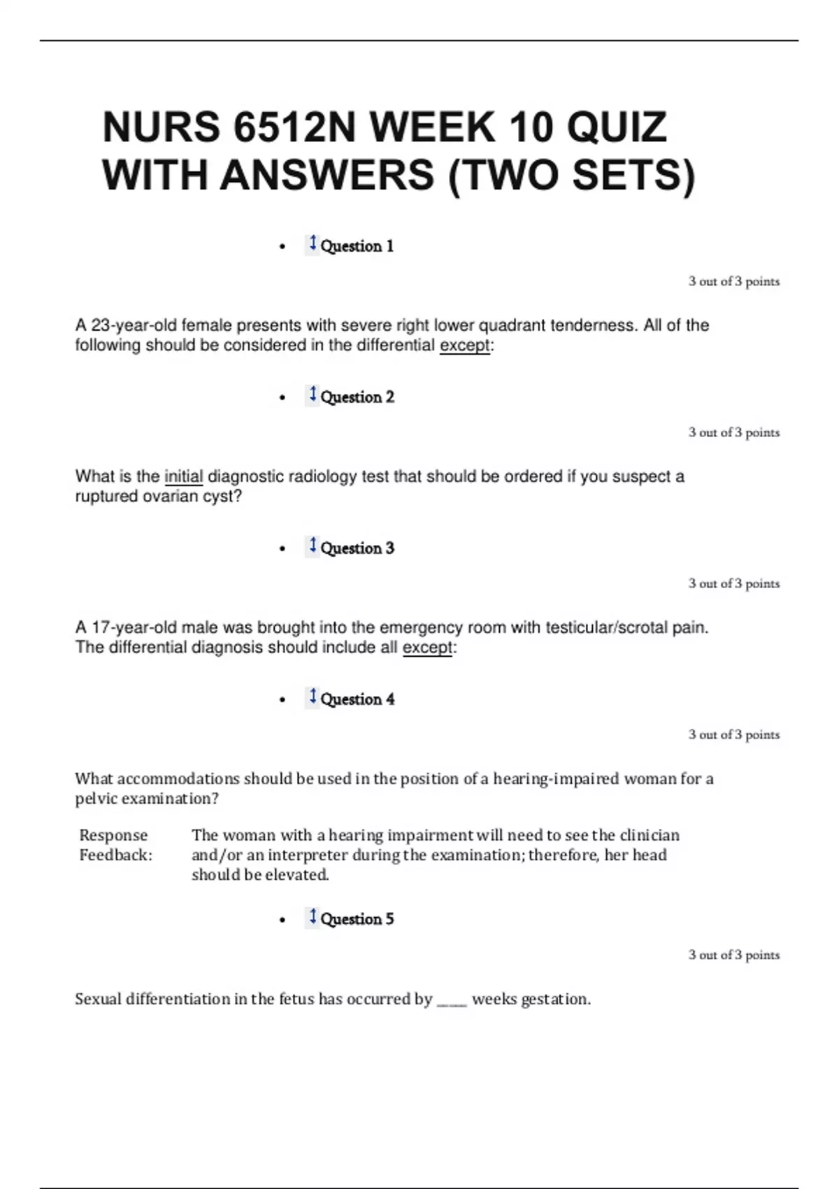 NURS 6512N WEEK 10 QUIZ WITH ANSWERS (TWO SETS) • Question 1 3 out of 3 points A 23-year-old female presents with severe right lower quadrant tenderness. All of the following should be considered in the differential except: • Question 2 3 out of 3 points What is the initial diagnostic radiology test that should be ordered if you suspect a ruptured ovarian cyst? • Question 3 3 out of 3 points A 17-year-old male was brought into the emergency room with testicular/scrotal pain. The differential diagnosis should include all except: • Question 4 3 out of 3 points What accommodations should be used in the position of a hearing-impaired woman for a pelvic examination? Response Feedback: The woman with a hearing impairment will need to see the clinician and/or an interpreter during the examination; therefore, her head should be elevated. • Question 5 3 out of 3 points Sexual differentiation in the fetus has occurred by _____ weeks gestation. Response Feedback: By 12 weeks gestation, sexual differentiation has occurred in the fetus. • Question 6 3 out of 3 points A mother brings her 8-year-old daughter to the clinic because the child says it hurts to urinate after she fell while riding her bicycle. Upon inspection, you find posterior vulvar and gross perineum bruising. These findings are consistent with: Response Feedback: A straddle injury from a bicycle seat is usually evident over the symphysis pubis; injuries resulting from sexual molestation are generally more posterior and may involve the perineum grossly. • Question 7 3 out of 3 points You palpate a soft, slightly tender mass in the right scrotum of an adult male. You attempt to reduce the size of the mass, and there is no change in the mass size. Your next assessment maneuver is to: Response Feedback: A soft mass is either a hernia or hydrocele. If the mass can be reduced, it is probably a hernia; a nonreducible mass should be transilluminated to determine whether it contains fluid and is possibly due to a hydrocele. Lifting the scrotum should be done when epididymitis is suspected. Urethral cultures are not indicated at this point. • Question 8 3 out of 3 points Palpation of a normal prostate in an older adult is likely to feel: Response Feedback: Older men are more likely to experience prostate hypertrophy, which, when palpated, feels smooth, rubbery, and symmetric. • Question 9 3 out of 3 points Documentation of a breast mass location is: