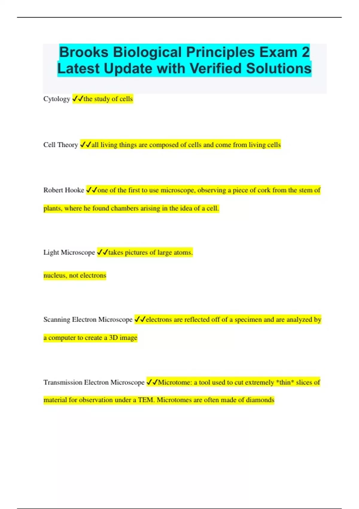 Brooks Biological Principles Exam 2 Latest Update with Verified Solutions Cytology the study of cells Cell Theory all living things are composed of cells and come from living cells Robert Hooke one of the first to use microscope, observing a piece of cork from the stem of plants, where he found chambers arising in the idea of a cell. Light Microscope takes pictures of large atoms. nucleus, not electrons Scanning Electron Microscope electrons are reflected off of a specimen and are analyzed by a computer to create a 3D image Transmission Electron Microscope Microtome: a tool used to cut extremely *thin* slices of material for observation under a TEM. Microtomes are often made of diamonds Can you see electrons using the electron microscopes? No, can only see neutrons & protons Why are most cells small? To maximize the ratio of surface area to volume for regulating the internal cell environment Smaller cells have bigger membranes Does cell need a bigger surface area or volume? surface area Plasma Membrane aka "Fluid Mosaic Model" composed of fluidlike phospholipid bilayer, proteins, cholesterol (*helps maintain proper fluid viscosity*), and glycoproteins (antigens: "name tags" for immune system) "self" antigen: produced by the body "not self" antigen: not produced by the body so antigens will attack this Get sick more when younger because body is still learning these "name tags" Arthritis: autoimmune disease where the body attacks itself Pollen grain: not self, antigens will attack = phagocytosis involved in *ATP production* and the electron transport system Cell Wall outside of the cell membrane in some organisms (plants); composed of carbohydrates or carbohydrate derivatives (peptidoglycan for bacteria) Cytoplasm material outside the nucleus • site for metabolic activity • cytosol: solution with dissolved substances such as glucose, CO2, & O2, etc • organelles: membrane-bound subunits of cells with specialized functions Cytoskeleton supportive and metabolic structure composed of microtubules (*biggest, tubular dimers*), microfilaments (*smallest, actin*), and intermediate filaments Microtubules form cilia (*numerous & short*) , flagella ( *long, usually 1 or 2*) , & centrioles Prokaryotes have a simple cellular organization with no nucleus or other membrane-bound organelles • nucleoid w/ DNA in continuous loop • 360 flagella rotation • ribosomes present • plasma membrane produces ATP • cell wall Ex: Bacteria & Archaea Eukaryotes have a complex cellular organization; membrane-bound organelles, located inside the cell membrane Nucleus contains the dna in form