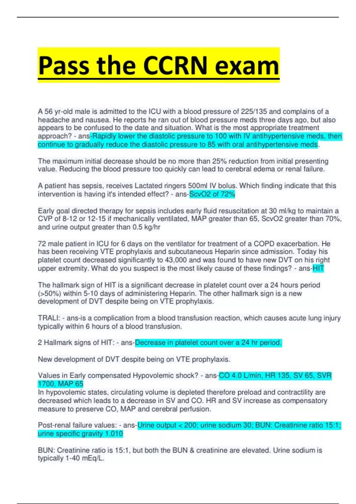 Pass the CCRN exam A 56 yr-old male is admitted to the ICU with a blood pressure of 225/135 and complains of a headache and nausea. He reports he ran out of blood pressure meds three days ago, but also appears to be confused to the date and situation. What is the most appropriate treatment approach? - ans-Rapidly lower the diastolic pressure to 100 with IV antihypertensive meds, then continue to gradually reduce the diastolic pressure to 85 with oral antihypertensive meds. The maximum initial decrease should be no more than 25% reduction from initial presenting value. Reducing the blood pressure too quickly can lead to cerebral edema or renal failure. A patient has sepsis, receives Lactated ringers 500ml IV bolus. Which finding indicate that this intervention is having it's intended effect? - ans-ScvO2 of 72% Early goal directed therapy for sepsis includes early fluid resuscitation at 30 ml/kg to maintain a CVP of 8-12 or 12-15 if mechanically ventilated, MAP greater than 65, ScvO2 greater than 70%, and urine output greater than 0.5 kg/hr 72 male patient in ICU for 6 days on the ventilator for treatment of a COPD exacerbation. He has been receiving VTE prophylaxis and subcutaneous Heparin since admission. Today his platelet count decreased significantly to 43,000 and was found to have new DVT on his right upper extremity. What do you suspect is the most likely cause of these findings? - ans-HIT The hallmark sign of HIT is a significant decrease in platelet count over a 24 hours period (>50%) within 5-10 days of administering Heparin. The other hallmark sign is a new development of DVT despite being on VTE prophylaxis. TRALI: - ans-is a complication from a blood transfusion reaction, which causes acute lung injury typically within 6 hours of a blood transfusion. 2 Hallmark signs of HIT: - ans-Decrease in platelet count over a 24 hr period. New development of DVT despite being on VTE prophylaxis. Values in Early compensated Hypovolemic shock? - ans-CO 4.0 L/min, HR 135, SV 65, SVR 1700, MAP 65 In hypovolemic states, circulating volume is depleted therefore preload and contractility are decreased which leads to a decrease in SV and CO. HR and SV increase as compensatory measure to preserve CO, MAP and cerebral perfusion. Post-renal failure values: - ans-Urine output < 200; urine sodium 30; BUN: Creatinine ratio 15:1; urine specific gravity 1.010 BUN: Creatinine ratio is 15:1, but both the BUN & creatinine are elevated. Urine sodium is typically 1-40 mEq/L. What to do in the event of HIT: - ans-Stop Heparin and administer an alternative direct thrombin inhibitor. Warfarin is contraindicated in HIT? T/F - ans-True - there is also no evidence that shows protamine, corticosteroids, and benadryl are effective treatments for HIT Patients with right ventricular infarctions become preload dependent. Meds that decrease preload should be avoided - which meds are these? - ans-Morphine, Nitro, Beta blockers and diuretics. Polymorphic ventricular tachycardia aka Torsades is treated by? - ans-Magnesium Myocardial contusions generally impact which parts of the heart? and what would the values be? - ans-Atria & right ventricle because of the position of the heart in the chest. PAOP 6, PA Pressure 40/24, RA Pressure 16 Neurogenic shock signs? - ans-CVP: 3, CI: 2.5, SVR: 650, SBP: 88 Neuro shock is associated with a loss of sympathetic tone causing extensive peripheral vasodilation. Clinical signs and symptoms include hypotension, a low SVR, low CVP and low normal CI What causes a larger than normal A wave on a PAOP? - ans-Mitral stenosis - causes increased left atrial pressure during atrial contraction. Pulmonary HTN will result in what? - ans-Elevated PA pressures but have no impact on PAOP. Infective Endocarditis can cause what kind of impairment? - ans-Neurologic impairment. One of the risks of infective endocarditis is the bacterial strand breaking in the heart and throwing bacterial emboli forward into the lungs from the right side of the heart or to the brain/body from the left side of the heart. Neurologic impairment could be a sign? - ans-Embolic ischemic stroke. Post bariatric surgery should avoid what kind of meds? - ans-Extended release meds due to absorption concerns post-operatively Chlorpropamide is a what? - ans-sulfonylurea drug that is used in DI as an antidiuretic. It is primarily a glucose lowering agent. (hypoglycemia) Will a cardiac transplant patient respond to atropine? - ans-No - pacing is the best instrument for symptomatic bradycardia. Elevated urine osmolality; decreased serum osmolality; and decreased serum sodium is what symptom? - ans-SIADH - causes retention of water. Urine production is minimal and concentrated & leads to an increased urine osmolality. What does Neo drug increase? - ans-SVR - Peripheral constriction Treatment for narrow complex, regular rhythm? - ans-Administer 6mg adenosine rapidly IVP Half life of metformin? - ans-6 hours - close monitoring is required to ensure the blood glucose level does not climb too quickly while dextrose is being administered. Most accurate reflection of daily fluid balance? - ans-Record a daily weight at the same time each day. Wide mediastinum on chest x-ray, narrow pulse pressure, and hypotension are signs of what? - ans-Cardiac tamponade A patient with hyponatremia would need what? - ans-Help maintaining a safe environment. HypoNa impairs judgment, and causes confusion. Peritoneal dialysis works on the principles of both? - ans-Diffusion and osmosis. HHNS leads to what? - ans-Large fluid deficits and may require multiple liters of fluid, which is determined by the patient's level of dehydration and hyperosmolality. What parameters are consistent with Pulsus Paradoxes? - ans-Decrease in SBP>10 during inspiration. Before administering rtPA what must happen? - ans-Lower the BP to at least 185/110. An elevated BP prior to rtPA can cause hemorrhage. Ibutilide can cause what? - ans-Torsades A person with disecting AAA would receive what
