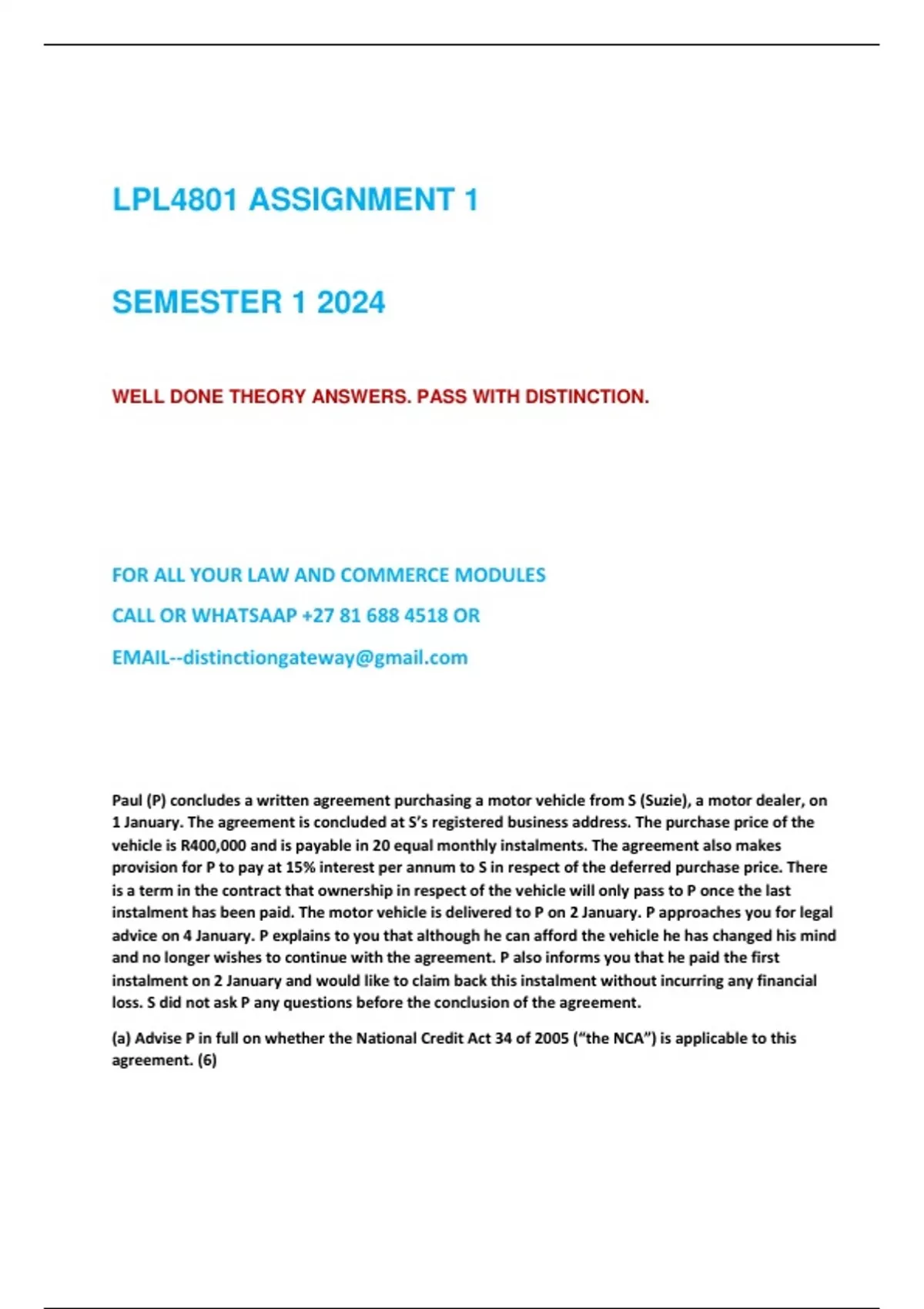 (a) Advise P in full on whether the National Credit Act 34 of 2005 (“the NCA”) is applicable to this