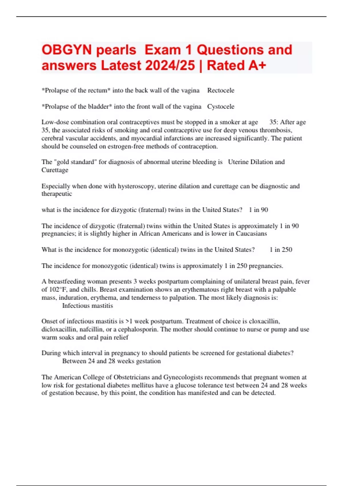 OBGYN pearls Exam 1 Questions and answers Latest 2024/25 | Rated A+