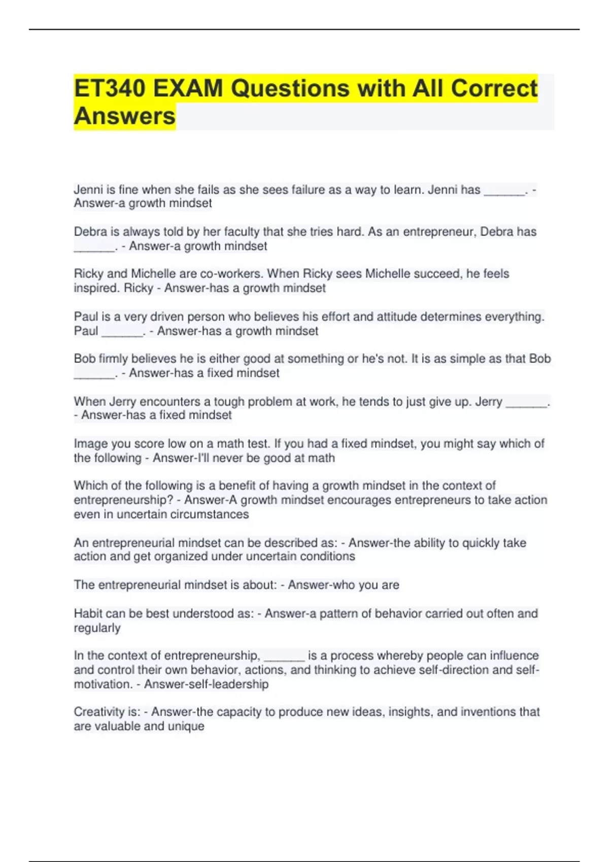 ET340 EXAM Questions with All Correct Answers Jenni is fine when she fails as she sees failure as a way to learn. Jenni has ______. - Answer-a growth mindset Debra is always told by her faculty that she tries hard. As an entrepreneur, Debra has ______. - Answer-a growth mindset Ricky and Michelle are co-workers. When Ricky sees Michelle succeed, he feels inspired. Ricky - Answer-has a growth mindset Paul is a very driven person who believes his effort and attitude determines everything. Paul ______. - Answer-has a growth mindset Bob firmly believes he is either good at something or he's not. It is as simple as that Bob ______. - Answer-has a fixed mindset When Jerry encounters a tough problem at work, he tends to just give up. Jerry ______. - Answer-has a fixed mindset Image you score low on a math test. If you had a fixed mindset, you might say which of the following - Answer-I'll never be good at math Which of the following is a benefit of having a growth mindset in the context of entrepreneurship? - Answer-A growth mindset encourages entrepreneurs to take action even in uncertain circumstances An entrepreneurial mindset can be described as: - Answer-the ability to quickly take action and get organized under uncertain conditions The entrepreneurial mindset is about: - Answer-who you are Habit can be best understood as: - Answer-a pattern of behavior carried out often and regularly In the context of entrepreneurship, ______ is a process whereby people can influence and control their own behavior, actions, and thinking to achieve self-direction and self-motivation. - Answer-self-leadership