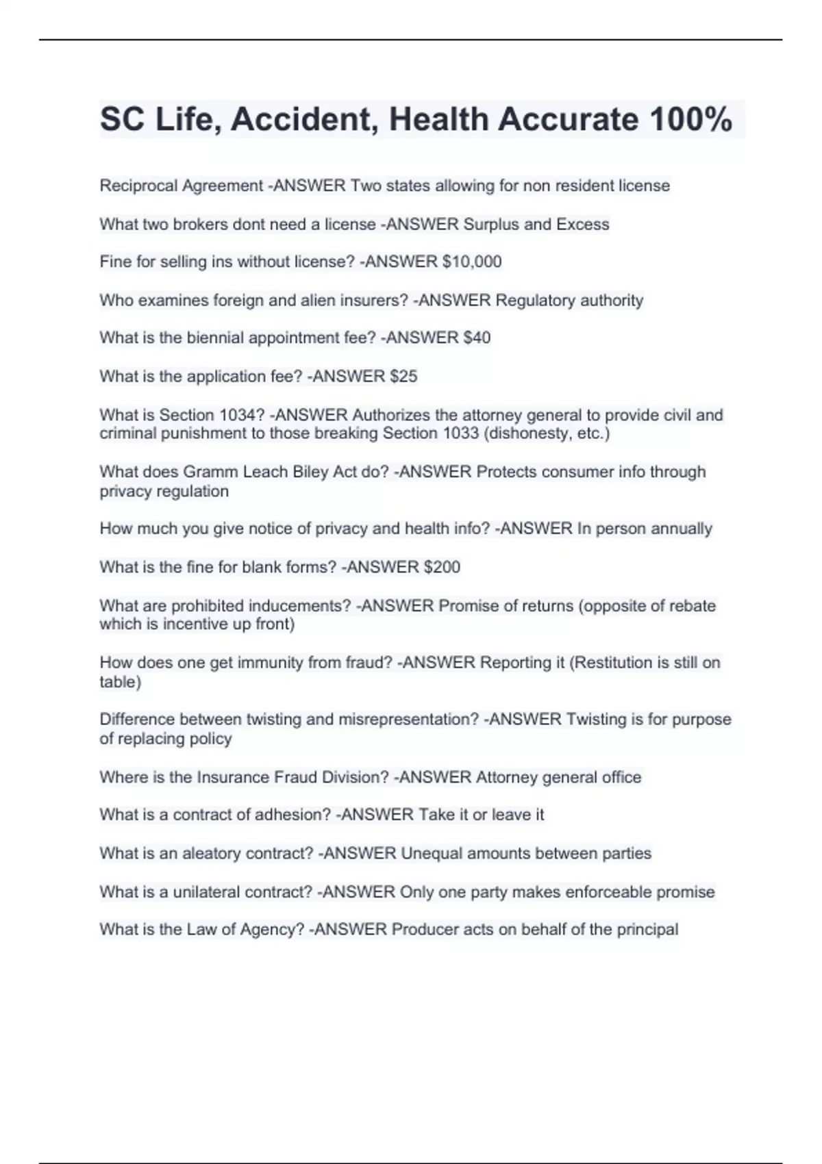 Reciprocal Agreement -ANSWER Two states allowing for non resident license What two brokers dont need a license -ANSWER Surplus and Excess Fine for selling ins without license? -ANSWER $10,000 Who examines foreign and alien insurers? -ANSWER Regulatory authority What is the biennial appointment fee? -ANSWER $40 What is the application fee? -ANSWER $25 What is Section 1034? -ANSWER Authorizes the attorney general to provide civil and criminal punishment to those breaking Section 1033 (dishonesty, etc.) What does Gramm Leach Biley Act do? -ANSWER Protects consumer info through privacy regulation How much you give notice of privacy and health info? -ANSWER In person annually What is the fine for blank forms? -ANSWER $200 What are prohibited inducements? -ANSWER Promise of returns (opposite of rebate which is incentive up front) How does one get immunity from fraud? -ANSWER Reporting it (Restitution is still on table) Difference between twisting and misrepresentation? -ANSWER Twisting is for purpose of replacing policy Where is the Insurance Fraud Division? -ANSWER Attorney general office What is a contract of adhesion? -ANSWER Take it or leave it What is an aleatory contract? -ANSWER Unequal amounts between parties What is a unilateral contract? -ANSWER Only one party makes enforceable promise What is the Law of Agency? -ANSWER Producer acts on behalf of the principal What are the pieces of a contract? -ANSWER Agreement (Offer/Acceptance), Consideration, Competent Parties, Legal Purpose Why purpose does the government provide insurance? -ANSWER Social purposes What are living benefits? -ANSWER Cash Value of policy How can CV be accessed? -ANSWER Withdraw, Surrender, and Policy Loan What do estate death benefits help pay? -ANSWER Taxes on assets as well as any potential debts What is the difference between a Viatical Settlement and a Life Settlement? -ANSWER Viatical has a higher premium due to lower life expectancy. For Viatical, the insured must be terminally or chronically ill. Terminal ill means life expectancy shorter than 24 months. What is insurable interest? -ANSWER When someone or a company has interest in your life or property How long is the contestability Period? -ANSWER 2 years What is a buy sell agreement? -ANSWER It is where the owners interest is bought by partners (doesn't fund) What is a cross purchase buy sell? -ANSWER Where partners of shareholders are each others beneficiaries so the death benefit can be used to pay their interest in the company What is an entity buy sell? -ANSWER When business is a party in the agreement and pays for partners policies (4 partners, 4 policies) Key person buy sell? -ANSWER When the company wants to insure one person to make up for potential lost income and knowledge resulting from their death What is a deferred comp plan? -ANSWER This is when someone sets aside money into the plan to save for typically retirement What is an executive bonus plan? -ANSWER When employer pays part or all premium for an executive What are the characteristics of a permanent life policy? -ANSWER -To age 100 -Large premiums, if unused they are paid back in dividends -Not taxable income What are the characteristics of a term life policy? -ANSWER -Limited time -There is a death benefit but no accumulating value (No CV) -smaller premiums What is a participating policy? -ANSWER -Usually from Mutual companies -Larger premiums but if unused will be paid back in dividends -Not taxable income