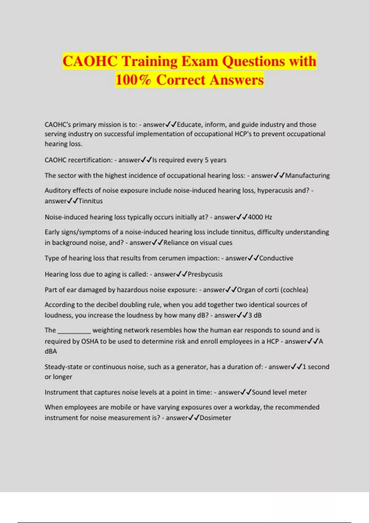 CAOHC Training Exam Questions with 100% Correct Answers CAOHC's primary mission is to: - answerEducate, inform, and guide industry and those serving industry on successful implementation of occupational HCP's to prevent occupational hearing loss. CAOHC recertification: - answerIs required every 5 years The sector with the highest incidence of occupational hearing loss: - answerManufacturing Auditory effects of noise exposure include noise-induced hearing loss, hyperacusis and? - answerTinnitus Noise-induced hearing loss typically occurs initially at? - answer4000 Hz Early signs/symptoms of a noise-induced hearing loss include tinnitus, difficulty understanding in background noise, and? - answerReliance on visual cues Type of hearing loss that results from cerumen impaction: - answerConductive Hearing loss due to aging is called: - answerPresbycusis Part of ear damaged by hazardous noise exposure: - answerOrgan of corti (cochlea) According to the decibel doubling rule, when you add together two identical sources of loudness, you increase the loudness by how many dB? - answer3 dB The _________ weighting network resembles how the human ear responds to sound and is required by OSHA to be used to determine risk and enroll employees in a HCP - answerA dBA Steady-state or continuous noise, such as a generator, has a duration of: - answer1 second or longer Instrument that captures noise levels at a point in time: - answerSound level meter When employees are mobile or have varying exposures over a workday, the recommended instrument for noise measurement is? - answerDosimeter OSHA recommends a minimum of a type _____ microphone for noise measurement equipment - answer2 The _______ is the HCP team professional most qualified to conduct noise measurements based on their education: - answerIndustrial Hygienist The ______ is the HCP team professional most qualified to recommend engineering controls: - answerAcoustical/noise control engineer Noise can be controlled at the _____, _____, or ______ - answerSource, path, receiver The following is the most effective way of delivering training/education: - answerOne on One The following element of a HCP, that is not included in the OSHA Noise Amendment, but makes it a model program: - answerAnalysis of program effectivem