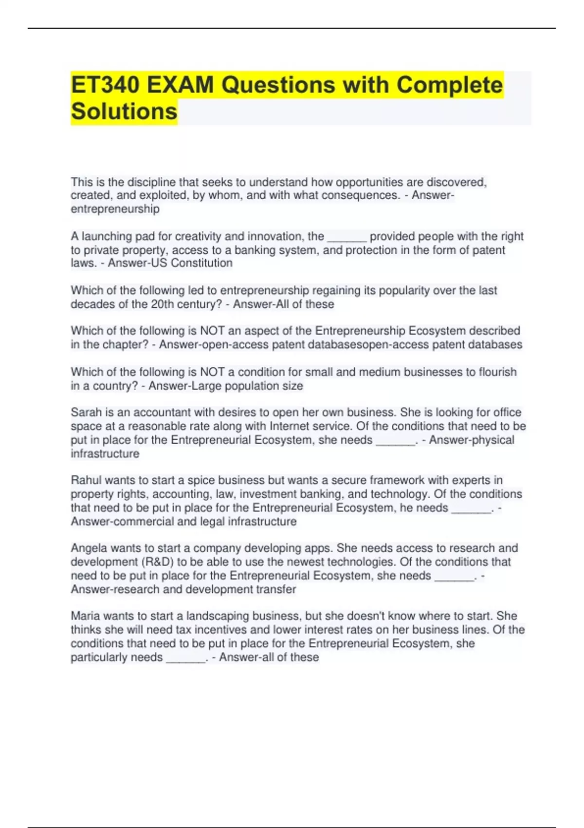 ET340 EXAM Questions with Complete Solutions This is the discipline that seeks to understand how opportunities are discovered, created, and exploited, by whom, and with what consequences. - Answerentrepreneurship A launching pad for creativity and innovation, the ______ provided people with the right to private property, access to a banking system, and protection in the form of patent laws. - Answer-US Constitution Which of the following led to entrepreneurship regaining its popularity over the last decades of the 20th century? - Answer-All of these Which of the following is NOT an aspect of the Entrepreneurship Ecosystem described in the chapter? - Answer-open-access patent databasesopen-access patent databases Which of the following is NOT a condition for small and medium businesses to flourish in a country? - Answer-Large population size Sarah is an accountant with desires to open her own business. She is looking for office space at a reasonable rate along with Internet service. Of the conditions that need to be put in place for the Entrepreneurial Ecosystem, she needs ______. - Answer-physical infrastructure Rahul wants to start a spice business but wants a secure framework with experts in property rights, accounting, law, investment banking, and technology. Of the conditions that need to be put in place for the Entrepreneurial Ecosystem, he needs ______. - Answer-commercial and legal infrastructure Angela wants to start a company developing apps. She needs access to research and development (R&D) to be able to use the newest technologies. Of the conditions that need to be put in place for the Entrepreneurial Ecosystem, she needs ______. - Answer-research and development transfer Maria wants to start a landscaping business, but she doesn't know where to start. She thinks she will need tax incentives and lower interest rates on her business lines. Of the conditions that need to be put in place for the Entrepreneurial Ecosystem, she particularly needs ______. - Answer-all of these Anthony wants to start a restaurant but he knows he has a lot to learn about starting a business. Of the conditions that need to be put in place for the Entrepreneurial Ecosystem, he particularly needs ______. a. financial resources - Answer-entrepreneurship education What invention came to symbolize the ingenuity of Colonial America? - Answer-The lightning rod Which Founding Father is considered one of history's greatest entrepreneurs? - Answer-Benjamin Franklin What factor(s) contributed to the golden age of entrepreneurship? - Answer-all of these During the______, everyone had a fairly equal chance of being an entrepreneur; inventors became more commonplace, producing new products and services alongside the merchants and industrialists. - Answer-First Industrial Revolution () During which period was entrepreneurship at its height? - Answer-Second Industrial Revolution () During the period between 1920 and 1975, which of the following did NOT contribute to the decline of the traditional entrepreneur? - Answer-The transition toward a knowledgebased economy. What era signaled a shift from the traditional entrepreneur to the big corporation? - Answer-Interwar and Postwar America During which period of time was the "tech entrepreneur" born? - Answer-Knowledge Economy 1.0, 1975-Present The older view to approaching entrepreneurship as a linear process (i.e. the steps are followed and the outcomes can be expected) is known as: - Answer-predictive logic Entrepreneurs who determine their goals based on the resources they have are using ______. - Answer-creation logic Planning for the catering at an event by sending out invitations and asking for RSVPs by a certain date is an example of ______. - Answer-predictive logic