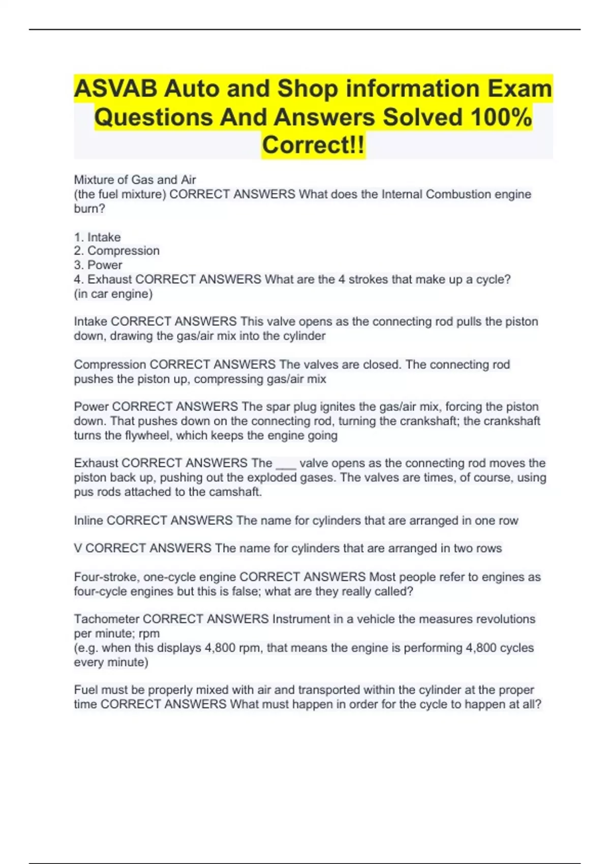 ASVAB Auto and Shop information Exam Questions And Answers Solved 100% Correct!!