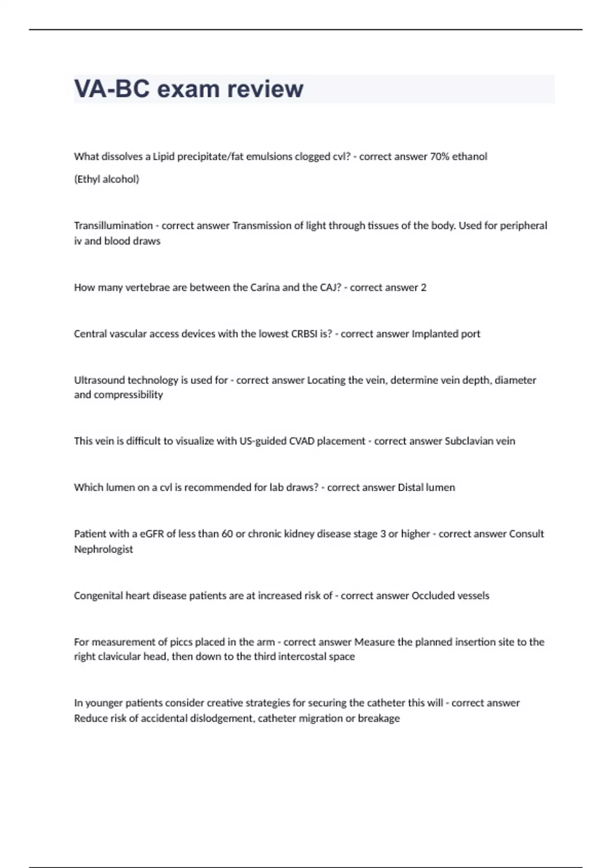 VA-BC exam review Question and answers correctly solved 2024 What dissolves a Lipid precipitate/fat emulsions clogged cvl? - correct answer 70% ethanol (Ethyl alcohol) Transillumination - correct answer Transmission of light through tissues of the body. Used for peripheral iv and blood draws How many vertebrae are between the Carina and the CAJ? - correct answer 2 Central vascular access devices with the lowest CRBSI is? - correct answer Implanted port Ultrasound technology is used for - correct answer Locating the vein, determine vein depth, diameter and compressibility This vein is difficult to visualize with US-guided CVAD placement - correct answer Subclavian vein Which lumen on a cvl is recommended for lab draws? - correct answer Distal lumen