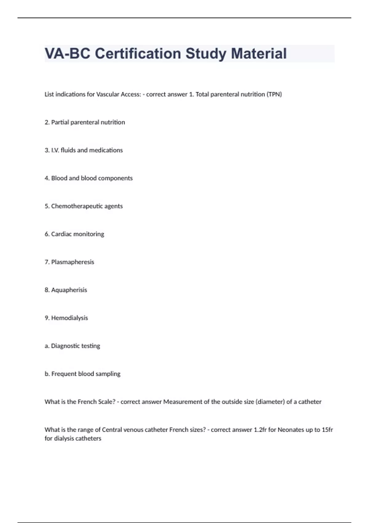 VA-BC Certification Study MaterialVA Question and answers already passed 2024List indications for Vascular Access: - correct answer 1. Total parenteral nutrition (TPN) 2. Partial parenteral nutrition 3. I.V. fluids and medications 4. Blood and blood components 5. Chemotherapeutic agents 6. Cardiac monitoring 7. Plasmapheresis 8. Aquapherisis 9. Hemodialysis a. Diagnostic testing b. Frequent blood sampling What is the French Scale? - correct answer Measurement of the outside size (diameter) of a catheter