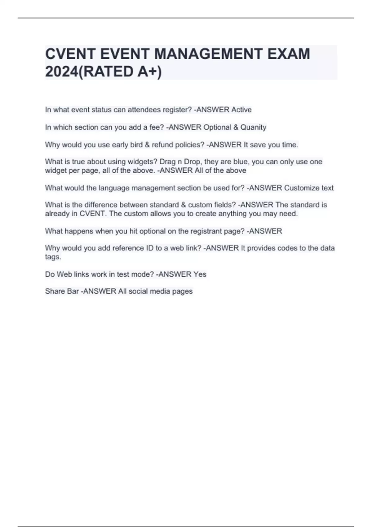 In what event status can attendees register? -ANSWER Active In which section can you add a fee? -ANSWER Optional & Quanity Why would you use early bird & refund policies? -ANSWER It save you time. What is true about using widgets? Drag n Drop, they are blue, you can only use one widget per page, all of the above. -ANSWER All of the above What would the language management section be used for? -ANSWER Customize text What is the difference between standard & custom fields? -ANSWER The standard is already in CVENT. The custom allows you to create anything you may need. What happens when you hit optional on the registrant page? -ANSWER Why would you add reference ID to a web link? -ANSWER It provides codes to the data tags. Do Web links work in test mode? -ANSWER Yes Shar