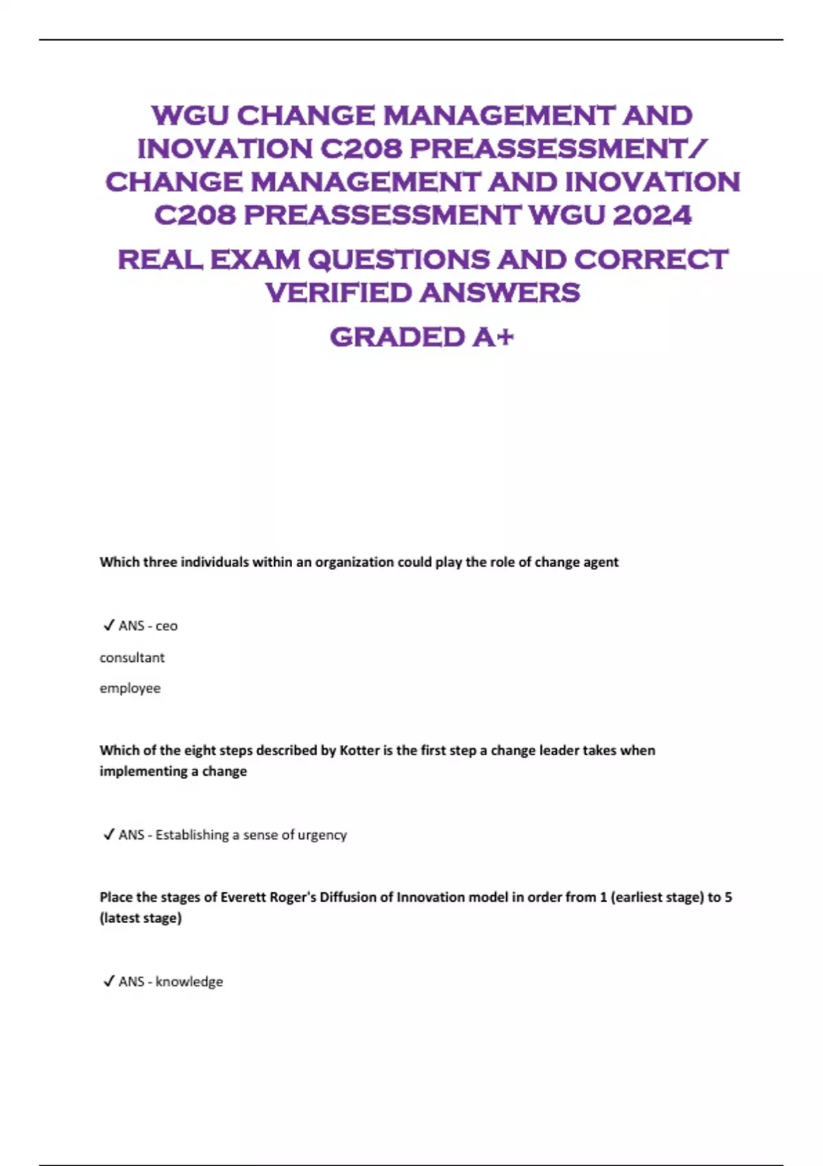 WGU CHANGE MANAGEMENT AND INOVATION C208 PREASSESSMENT/ CHANGE MANAGEMENT AND INOVATION C208 PREASSESSMENT WGU 2024 REAL EXAM QUESTIONS AND CORRECT VERIFIED ANSWERS GRADED A+