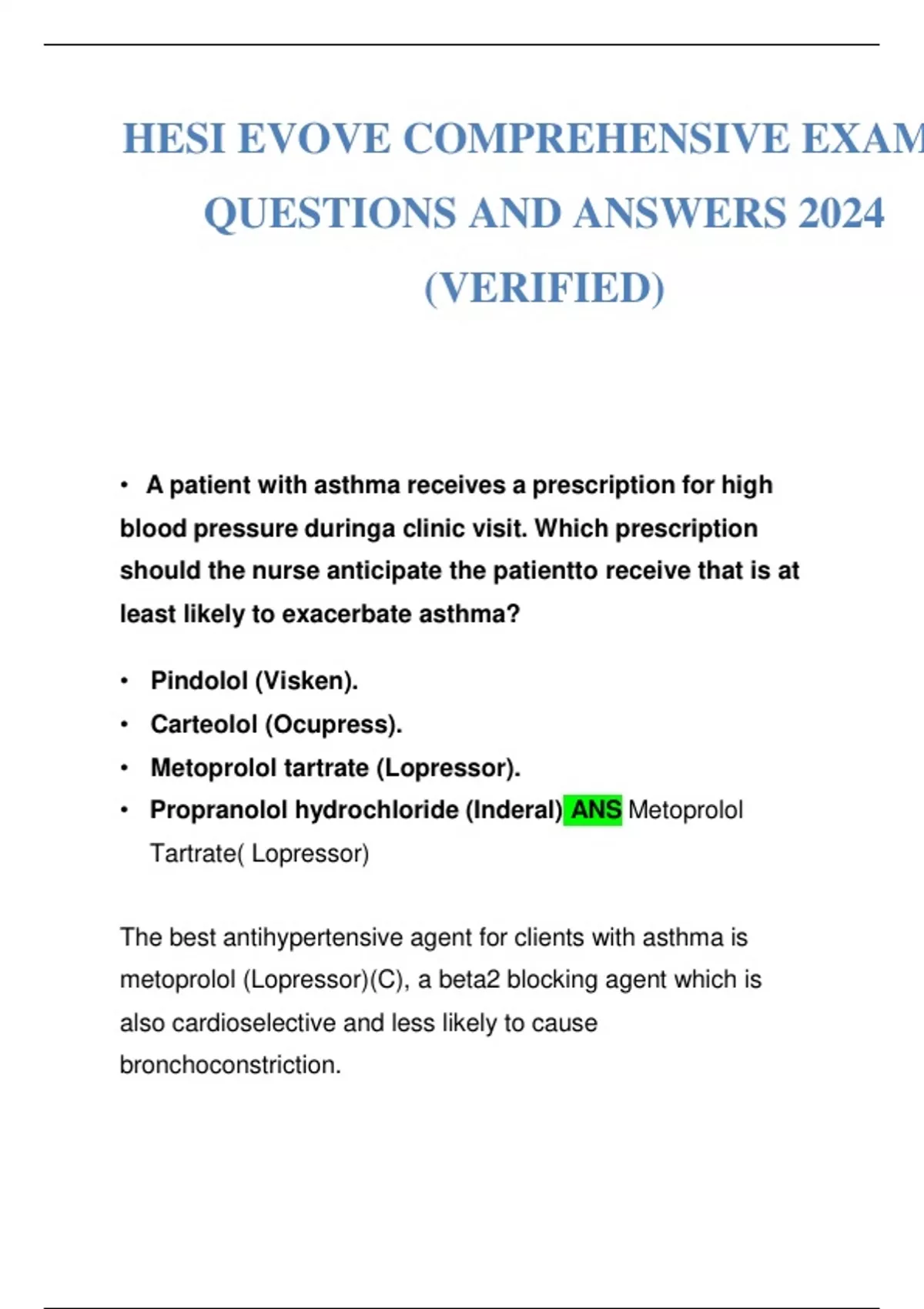 HESI EVOLVE COMPREHENSIVE EXAM 1 QUESTIONS AND ANSWERS 2024 (VERIFIED)