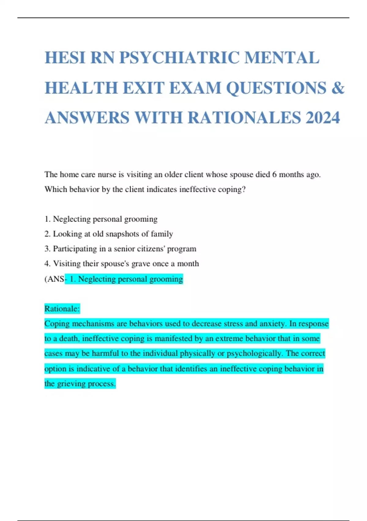 HESI RN PSYCHIATRIC MENTAL HEALTH EXIT EXAM QUESTIONS & ANSWERS WITH RATIONALES 2024