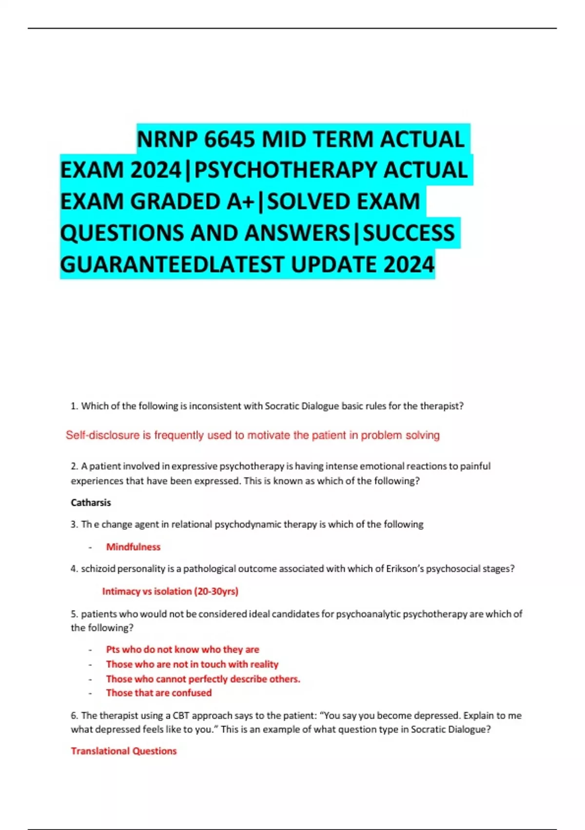 NRNP 6645 MID TERM ACTUAL EXAM 2024|PSYCHOTHERAPY ACTUAL EXAM GRADED A+|SOLVED EXAM QUESTIONS AND ANSWERS|SUCCESS GUARANTEEDLATEST UPDATE 2024