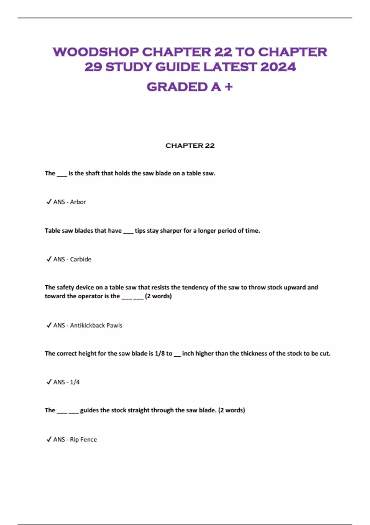 WOODSHOP CHAPTER 22 TO CHAPTER 29 STUDY GUIDE LATEST 2024 GRADED A +
