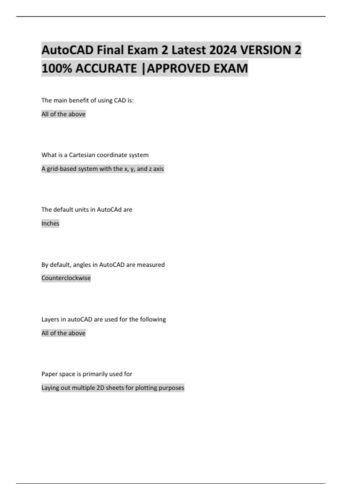 AutoCAD Final Exam 2 Latest 2024 VERSION 2 100% ACCURATE |APPROVED EXAM