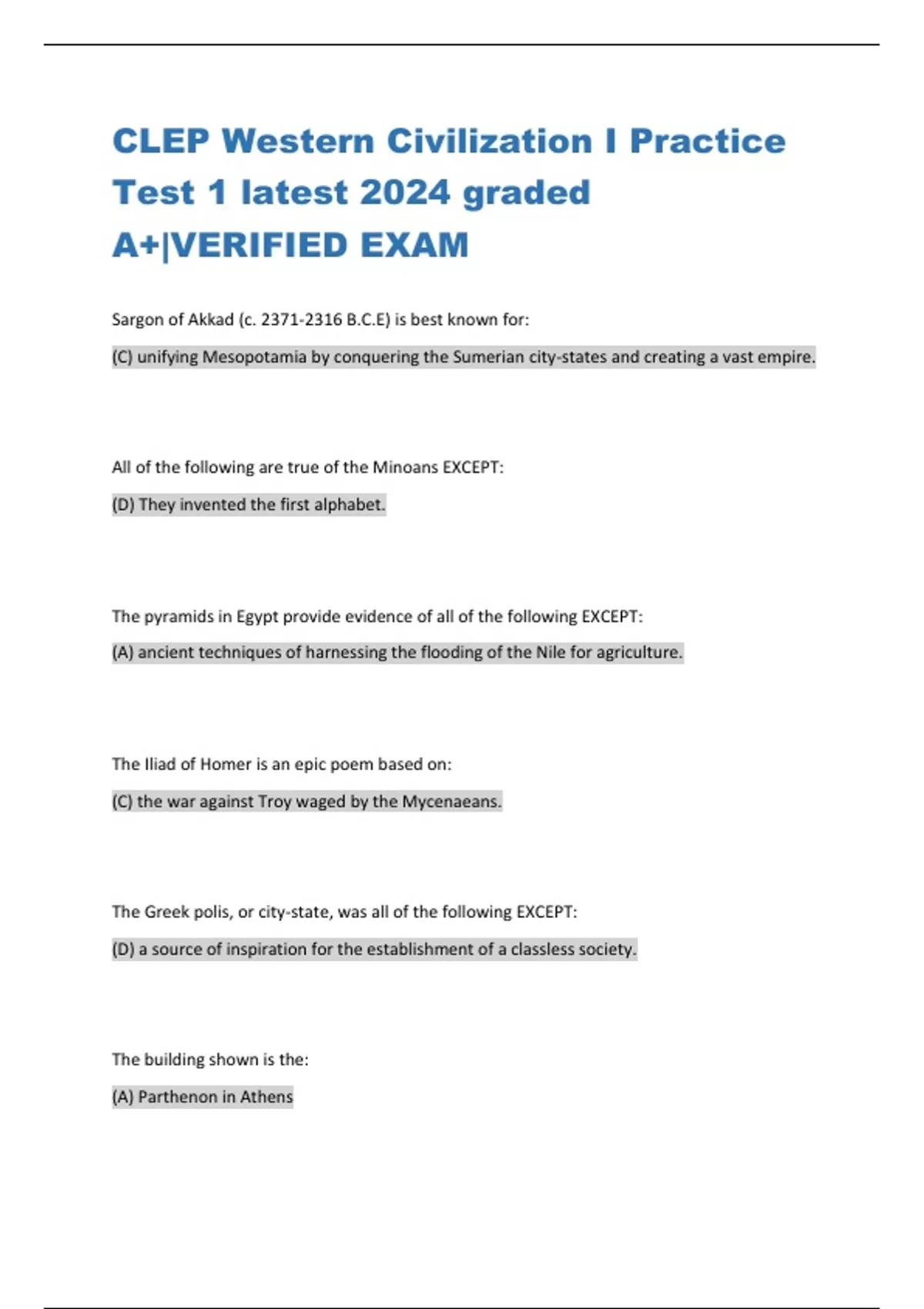 CLEP Western Civilization I Practice Test 1 latest 2024 graded A+|VERIFIED EXAM