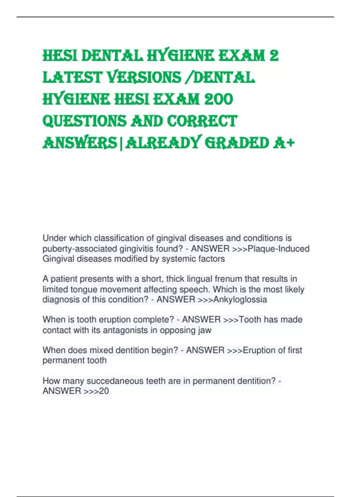 HESI DENTAL HYGIENE EXAM 2 LATEST VERSIONS /DENTAL HYGIENE HESI EXAM 200 QUESTIONS AND CORRECT ANSWERS|ALREADY GRADED A+