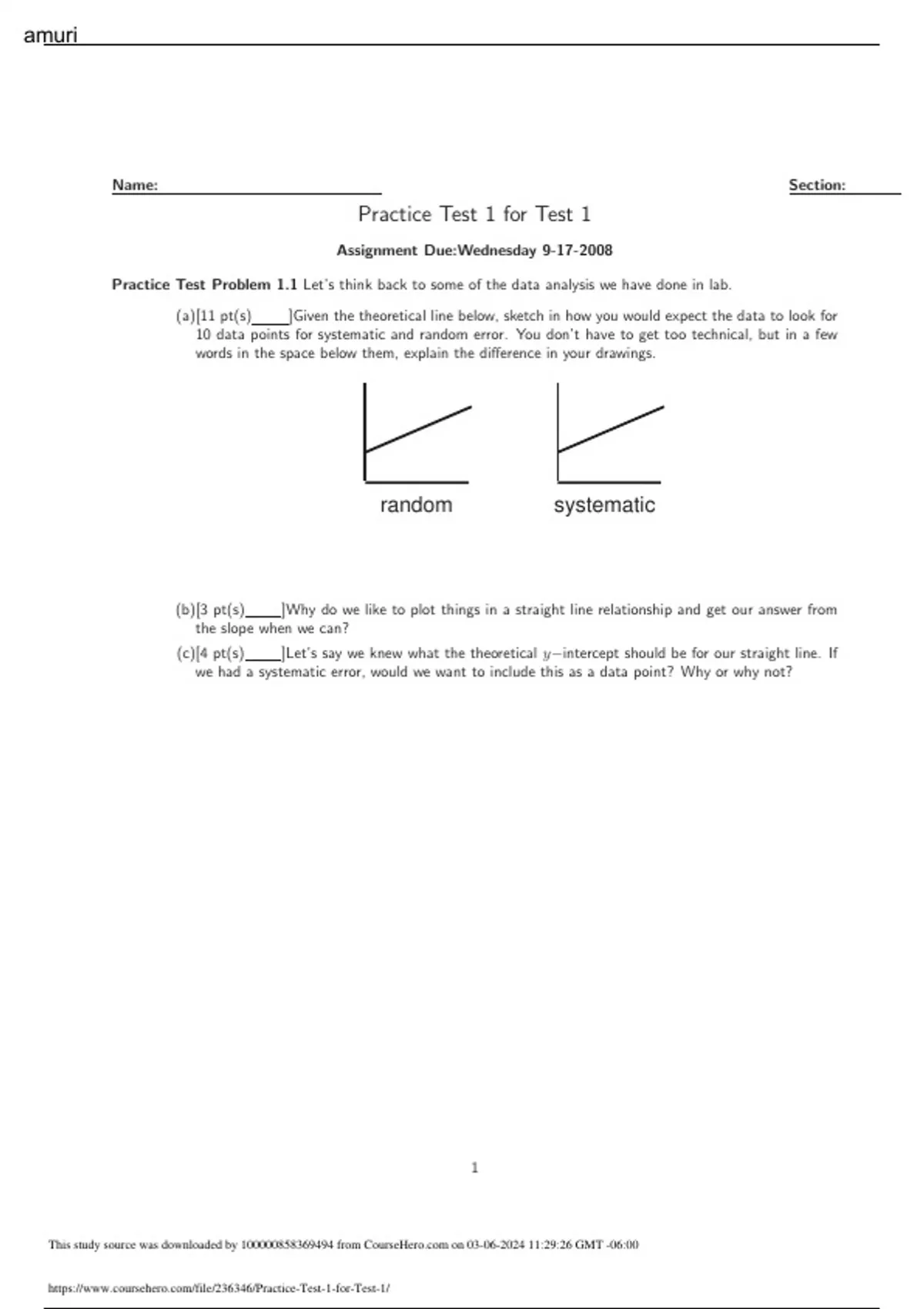 Practice Test 1 for Test 1Practice Test Problem 1.1 Let’s think back to some of the data analysis we have done in lab. (a)[11 pt(s) ]Given the theoretical line below, sketch in how you would expect the data to look for 10 data points for systematic and random error. You don’t have to get too technical, but in a few words in the space below them, explain the difference in your drawings. random systematic (b)[3 pt(s) ]Why do we like to plot things in a straight line relationship and get our answer from the slope when we can? (c)[4 pt(s) ]Let’s say we knew what the theoretical y−intercept should be for our straight line. If we had a systematic error, would we want to include this as a data point? Why or why not? 1 This study source was downloaded by from CourseH on :29:26 GMT -06:00 amuri Practice Test Problem 1.2 Bumper cars A and B move along in straight parallel paths. Their velocities are given in the graph at the right. (a)[5 pt(s) ]For the entire time interval shown, calculate the average accelerations for each car. Is the magnitude of the average acceleration of Car A greater than, less than or equal to that of Car B?. (b)[3 pt(s) ]At t = 4s, is the distance between the two cars changing or remaining constant? Explain. (c)[3 pt(s) ]Suppose that at t = 0s, Cars A and B were passing the same stalled bumper car located directly between them. At t = −1s, which car is closer to the stalled car? Explain. 8 6 4 2 0 -2 -4 -6 v (m/s) t (s) -1 0 1 2 3 4 5 Car A Car B Practice Test Problem 1.3 For the following described motion, draw a position-t