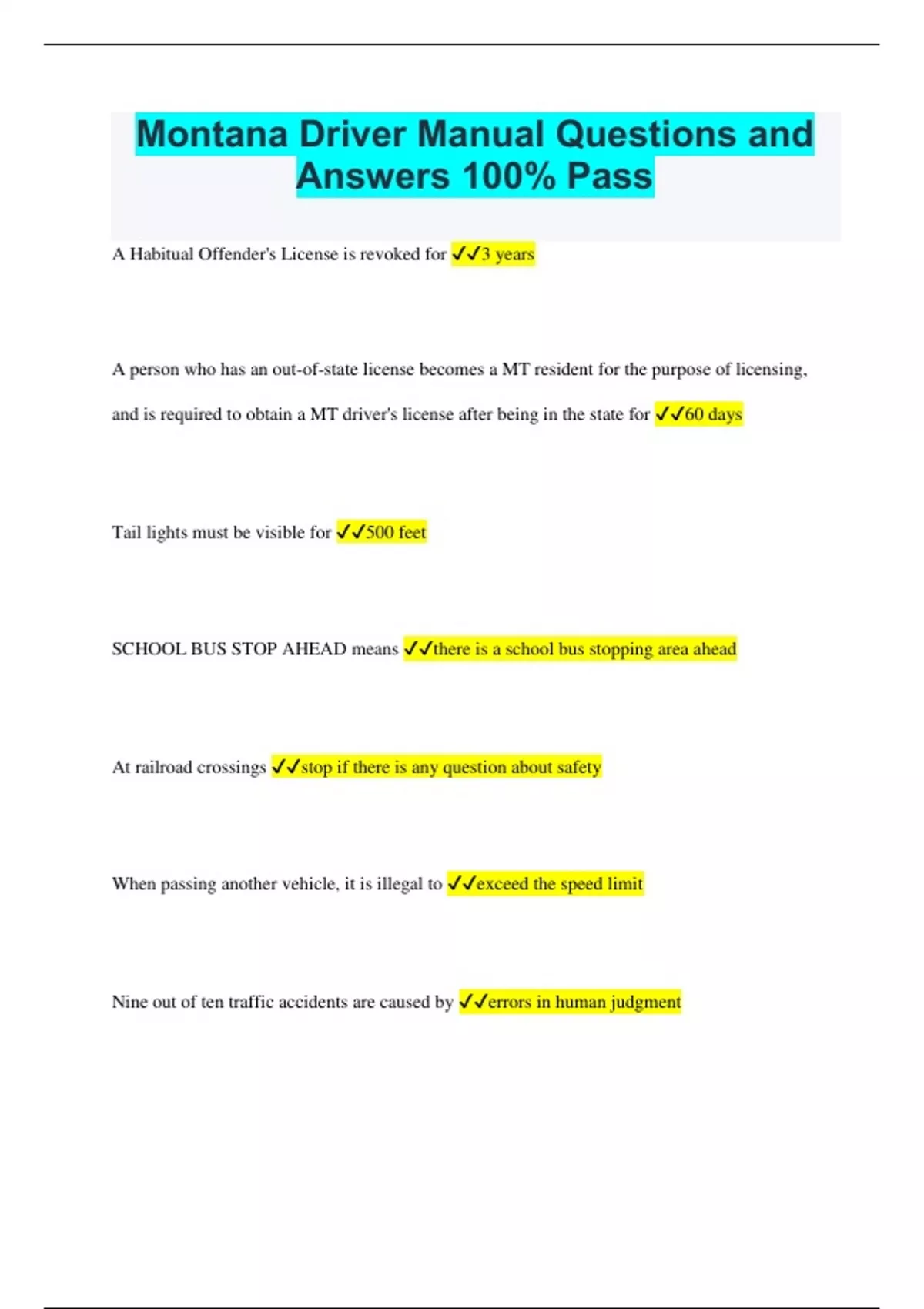 Montana Driver Manual Questions and Answers 100% Pass A Habitual Offender's License is revoked for 3 years A person who has an out-of-state license becomes a MT resident for the purpose of licensing, and is required to obtain a MT driver's license after being in the state for 60 days Tail lights must be visible for 500 feet SCHOOL BUS STOP AHEAD means there is a school bus stopping area ahead At railroad crossings stop if there is any question about safety When passing another vehicle, it is illegal to exceed the speed limit Nine out of ten traffic accidents are caused by errors in human judgment Drinking coffee and take a cold shower after become intoxicated does NOT make you sober up, more alert even though it does not change the amount of alcohol in your system very much, or burn off the alcohol in your system more quickly A person approaching any vehicle which displays a slow-moving vehicle emblem should be aware that the emblem indicates the vehicle's top speed is less than 25mph Upon hearing a siren of an emergency vehicle, a driver must stop at the right side of a street or roadway MEN WORKING means that there are men working ahead If you approach a turn in the wrong lane, or you have forgotten to signal, you should proceed straight, get in the proper lane, go to the next intersection, signal, then turn A load projecting beyond the rear end of a vehicle must display a red flag it it extends more than 4 feet Headlights must illuminate persons and objects for 350 feet on high beam, 250 on low beam A driver, upon meeting or overtaking a school bus from either direction which has stopped on the highway with its red lights flashing must: stop before reaching the bus and not proceed until the red lights are extinguished The sign below means |- there is a side road entering the highway from the right MT law defines Reckless Driving as driving with willful and wanton disregard for the safety of persons or property ROAD WORK AHEAD means the highway ahead is being repaired; approach with caution LOOSE GRAVEL means that the highway ahead is covered with loose gravel SCHOOL means that you must watch for children in this area at all times Habitual Offenders are those who have