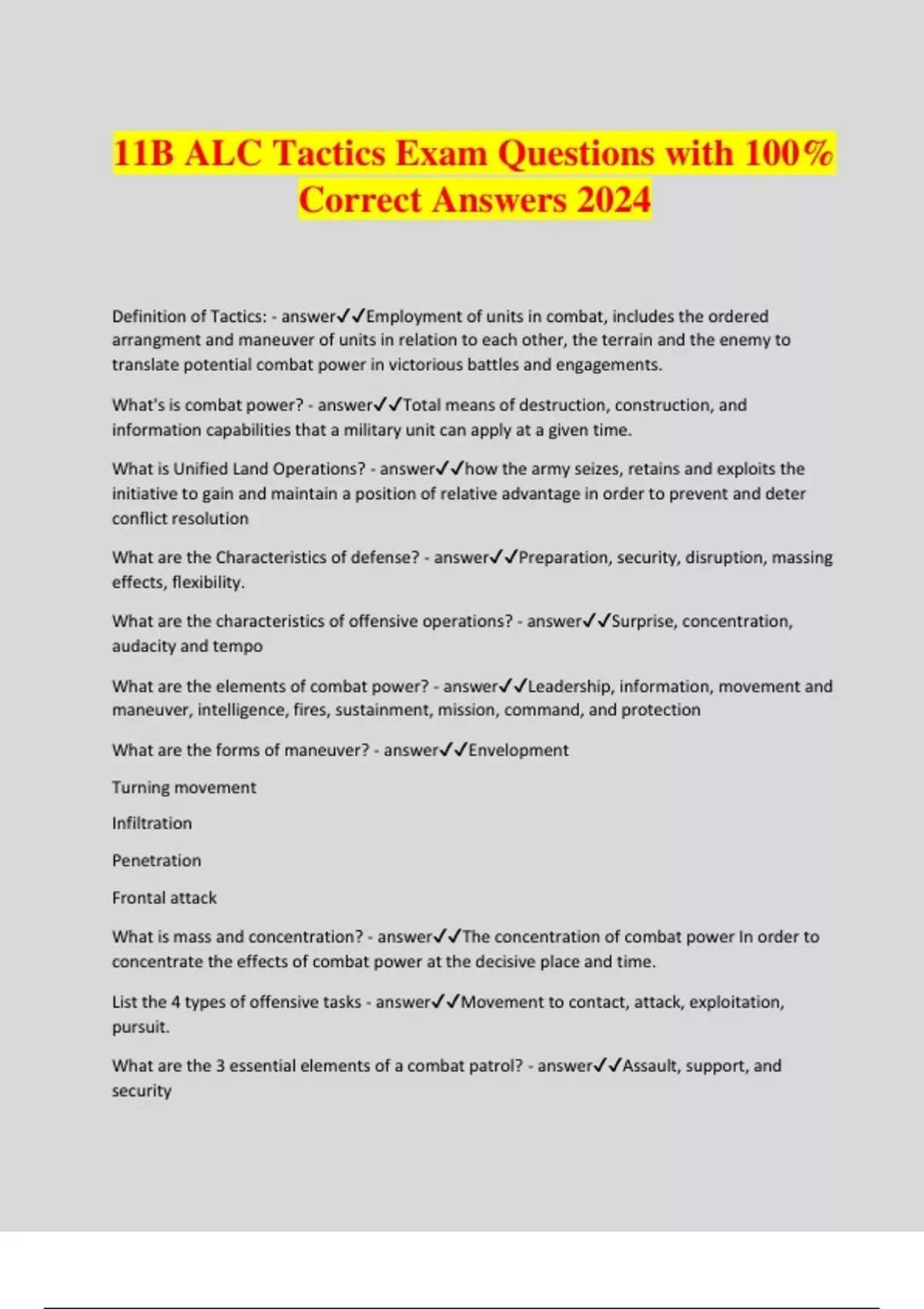 11B ALC Tactics Exam Questions with 100% Correct Answers 2024 Definition of Tactics: - answerEmployment of units in combat, includes the ordered arrangment and maneuver of units in relation to each other, the terrain and the enemy to translate potential combat power in victorious battles and engagements. What's is combat power? - answerTotal means of destruction, construction, and information capabilities that a military unit can apply at a given time. What is Unified Land Operations? - answerhow the army seizes, retains and exploits the initiative to gain and maintain a position of relative advantage in order to prevent and deter conflict resolution What are the Characteristics of defense? - answerPreparation, security, disruption, massing effects, flexibility. What are the characteristics of offensive operations? - answerSurprise, concentration, audacity and tempo What are the elements of combat power? - answerLeaders