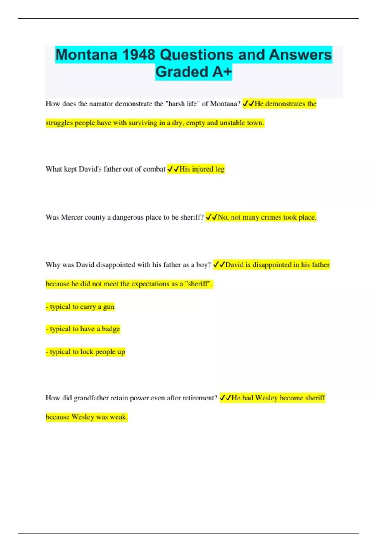 Montana 1948 Questions and Answers Graded A+ How does the narrator demonstrate the "harsh life" of Montana? He demonstrates the struggles people have with surviving in a dry, empty and unstable town. What kept David's father out of combat His injured leg Was Mercer county a dangerous place to be sheriff? No, not many crimes took place. Why was David disappointed with his father as a boy? David is disappointed in his father because he did not meet the expectations as a "sheriff". - typical to carry a gun - typical to have a badge - typical to lock people up How did grandfather retain power even after retirement? He had Wesley become sheriff because Wesley was weak. What did David's mom fear for?(part 1) David would not accept consequences and will not grow because of the hayden name. - What was Marie little soldiers job? David's caretaker -nanny How did David feel about Marie? He loves Marie like another mother figure. Who is Ronnie Tall bear? Why did he go to college? - Marie Little Soldier's boyfriend. -he does not go to college because of his race. How does wesley feel about idians? He is prejudice. He believes they are lazy and foolish. (Passive racism) According to mother, why didn't Marie want treatment? Frank was having affairs with Indian women Why was father concerned for himself about mother talking to him about frank? He did not know how to treat the situation. He was in numerous positions to act on franks crime. He could as - a brother - sheriff What did father say he was going to pick up that told the boy he was going to the Indian reservation? Honey Why did the house seem so different when the boy was home alone with Marie? He felt a burden of DEATH. When father made a suggestion about taking a vacation...what usually happened? It made everyone feel better What did grandfather give david when he went out riding A gun for hunting What did father believe a single rifle would do for the boy? - teach him how to make the shot count - save ammunition What did david shoot? A magpie What did david do from a distance as he watched Frank step towards his father? He held the gun as if he were going to shoot Frank. What did Frank promise father he'd do to resolve the situation? How did mother feel about it? How did father feel - he promised he would never do it again. Mother felt Frank should still be held accountable legally. - father took franks word so he did not have