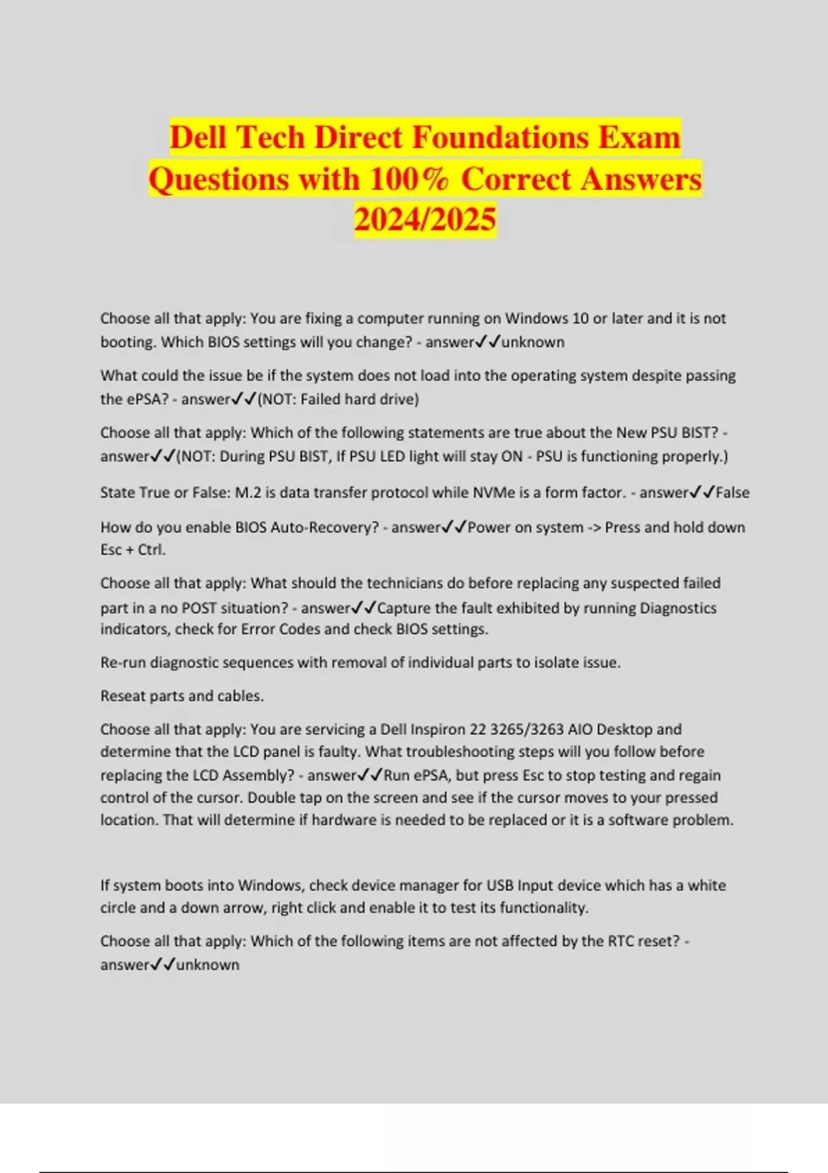 Dell Tech Direct Foundations Exam Questions with 100% Correct Answers 2024/2025 Choose all that apply: You are fixing a computer running on Windows 10 or later and it is not booting. Which BIOS settings will you change? - answerunknown What could the issue be if the system does not load into the operating system despite passing the ePSA? - answer(NOT: Failed hard drive) Choose all that apply: Which of the following statements are true about the New PSU BIST? - answer(NOT: During PSU BIST, If PSU LED light will stay ON - PSU is functioning properly.) State True or False: M.2 is data transfer protocol while NVMe is a form factor. - answerFalse How do you enable BIOS Auto-Recovery? - answerPower on system -> Press and hold down Esc + Ctrl. Choose all that apply: What should the technicians do before replacing any suspected failed part in a no POST situation? - answerCapture the fault exhibited by running Diagnostics indicators, check for Error Codes and check BIOS settings. Re-run diagnostic sequences with removal of individual parts to isolate issue. Reseat parts and cables. Choose all that apply: You are servicing a Dell Inspiron 22 3265/3263 AIO Desktop and determine that the LCD panel is faulty. What troubleshooting steps will you follow before replacing the LCD Assembly? - answerRun ePSA, but press Esc to stop testing and regain control of the cursor. Double tap on the screen and see if the cursor moves to your pressed location. That will determine if hardware is needed to be replaced or it is a software problem. If system boots into Windows, check device manager for USB Input device which has a white circle and a down arrow, right click and enable it to test its functionality. Choose all that apply: Which of the following items are not affected by the RTC reset? - answerunknown