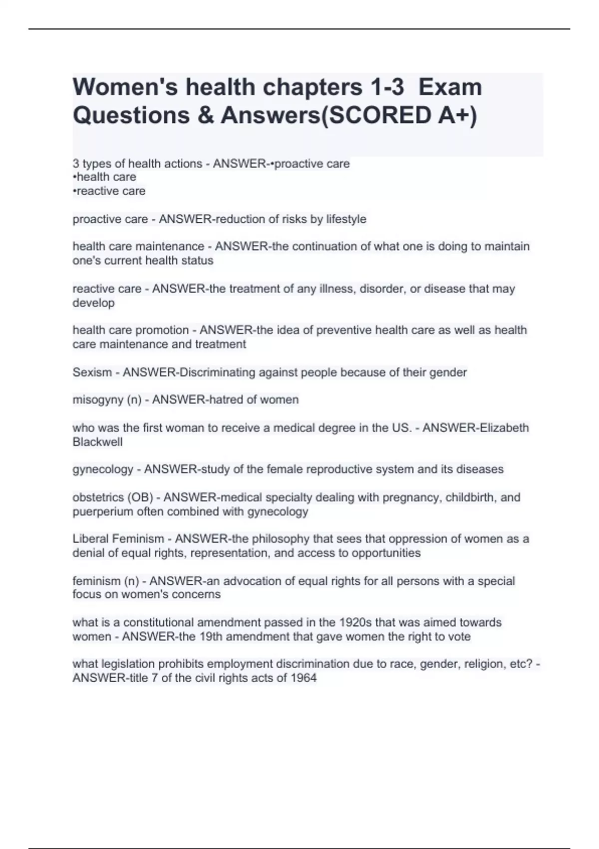 health care maintenance - ANSWER-the continuation of what one is doing to maintain one's current health status reactive care - ANSWER-the treatment of any illness, disorder, or disease that may develop health care promotion - ANSWER-the idea of preventive health care as well as health care maintenance and treatment Sexism - ANSWER-Discriminating against people because of their gender misogyny (n) - ANSWER-hatred of women who was the first woman to receive a medical degree in the US. - ANSWER-Elizabeth Blackwell gynecology - ANSWER-study of the female reproductive system and its diseases obstetrics (OB) - ANSWER-medical specialty dealing with pregnancy, childbirth, and puerperium often combined with gynecology Liberal Feminism - ANSWER-the philosophy that sees that oppression of women as a denial of equal rights, representation, and access to opportunities feminism (n) - ANSWER-an advocation of equal rights for all persons with a special focus on women's concerns what is a constitutional amendment passed in the 1920s that was aimed towards women - ANSWER-the 19th amendment that gave women the right to vote what legislation prohibits employment discrimination due to race, gender, religion, etc? - ANSWER-title 7 of the civil rights acts of 1964