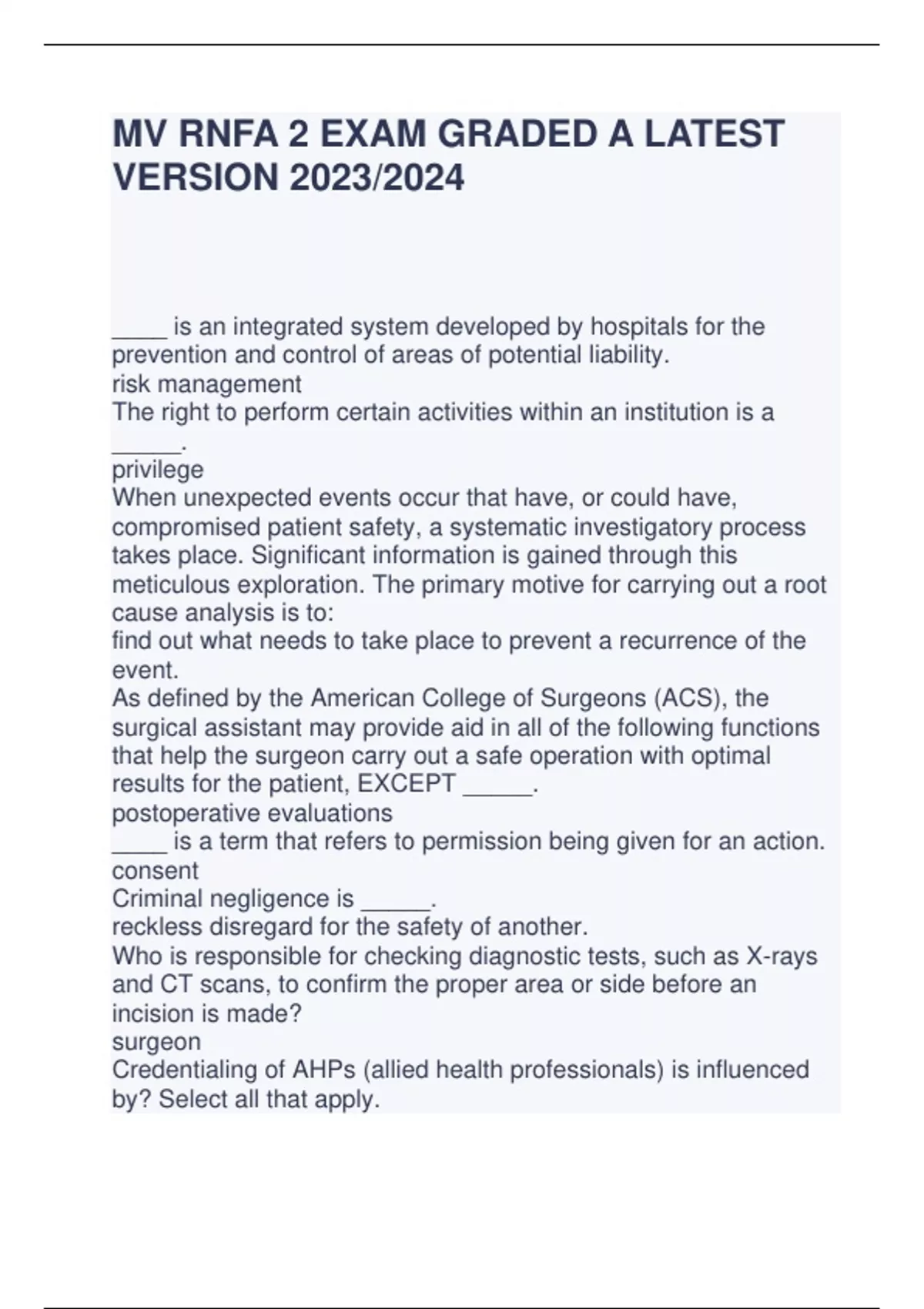 MV RNFA 2 EXAM GRADED A LATEST VERSION 2023/2024 ____ is an integrated system developed by hospitals for the prevention and control of areas of potential liability. risk management The right to perform certain activities within an institution is a _____. privilege When unexpected events occur that have, or could have, compromised patient safety, a systematic investigatory process takes place. Significant information is gained through this meticulous exploration. The primary motive for carrying out a root cause analysis is to: find out what needs to take place to prevent a recurrence of the event. As defined by the American College of Surgeons (ACS), the surgical assistant may provide aid in all of the following functions that help the surgeon carry out a safe operation with optimal results for the patient, EXCEPT _____. postoperative evaluations ____ is a term that refers to permission being given for an action. consent Criminal negligence is _____. reckless disregard for the safety of another. Who is responsible for checking diagnostic tests, such as X-rays and CT scans, to confirm the proper area or side before an incision is made? surgeon Credentialing of AHPs (allied health professionals) is influenced by? Select all that apply. a. state regulations b. scope of practice c. institutional policy d. medical bylaws e. regulatory compliance Which of the following reflects the basic values for health care practice? all of these Ethics is an attempt to define right and wrong based upon ____. beliefs Credentialing and granting of practice privileges is a _____ process Legal Morbidity and mortality may be greater with penetrating trauma because identification of injuries may be more difficult when injuries are less obvious. In the case of an adult victim with a lowvelocity, low-caliber gunshot wound, at far range, of the anterior left quadrant of the lower abdomen, what is the MOI and description of the possible injuries? Penetrating; small entrance wound, puncture of the anterior wall of the sigmoid colon, no disruption of vessels, and bullet not found in pelvis The occurrence of perioperative mortality in geriatric surgical patients is influenced by several evidence-based factors. Select the patient most at risk for perioperative mortality. Janice, age 70, scheduled for an emergency bowel resection with an ASA class IV Fluid and electrolytes play a key role in _____; I:maintaining homeostasis II:transporting oxygen III:blood clotting IV:maintaining temperature i, ii, iii, iv Age-related skin changes include a thinning epidermis and decreased subcutaneous fat and elasticity. What special consideration should the first assistant provide to avoid skin injuries? Gently lift, not slide, the patient to and from the OR bed. The immature blood-brain barrier and decreased protein binding in infants increase their sensitivity to which group of drugs? Opioids and hypnotics For the greatest concentration of antibiotic prophylaxis, the infusion should end within ___ hours of incision? 1 A number of screening tools have been developed to accurately establish biologic age. One tool, the Comprehensive Geriatric Assessment (CGA), is a multidimensional evaluation that scrutinizes medications, functional ability, co-morbid conditions, cognitive ability, mental function, nutritional status, and socioenvironmental factors. In geriatric medical studies, the CGA has been valuable in providing a metric for describing healthy aging and _____. identifying at-risk individuals. Traumatic deaths may occur in three phases, or time frames. The first phase occurs immediately after the injury, the second phase within the first 1 to 2 hours after the injury, and the third phase occurs days to weeks after the injury. Approximately 30% of total fatalities from trauma could be prevented with definitive trauma care, including appropriate and aggressive resuscitation with rapid transport to an appropriate facility. Which phase, or timeframe, of potential for trauma death, does this group represent? Phase II Preexisting pulmonary disease increases the risk of perioperative pulmonary complications. Which condition presents the most significant risk factor? Chronic obstructive pulmonary disease (COPD) _____ is the most frequently acquired nosocomial infection.