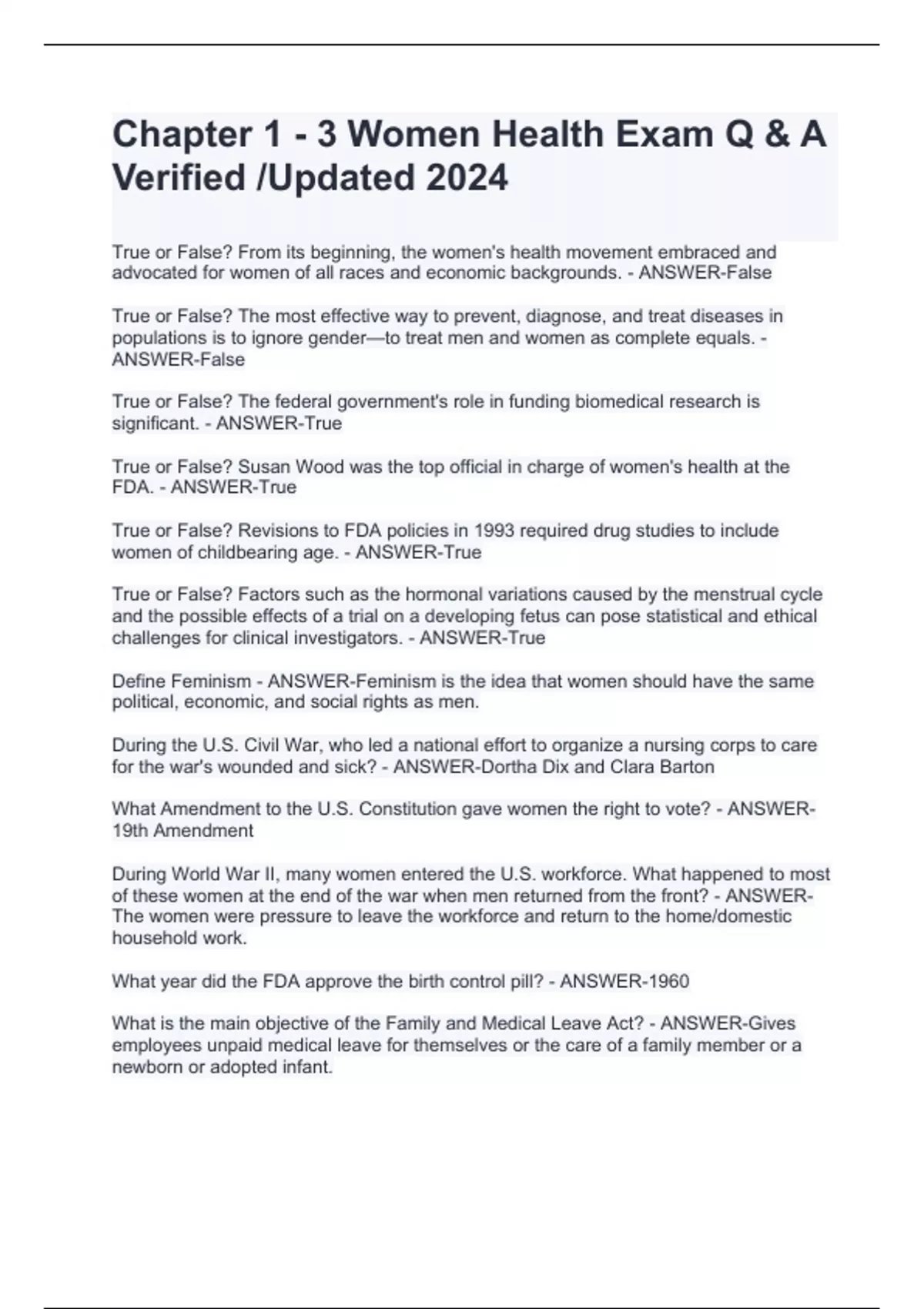 True or False? The most effective way to prevent, diagnose, and treat diseases in populations is to ignore gender—to treat men and women as complete equals. - ANSWER-False True or False? The federal government's role in funding biomedical research is significant. - ANSWER-True True or False? Susan Wood was the top official in charge of women's health at the FDA. - ANSWER-True True or False? Revisions to FDA policies in 1993 required drug studies to include women of childbearing age. - ANSWER-True True or False? Factors such as the hormonal variations caused by the menstrual cycle and the possible effects of a trial on a developing fetus can pose statistical and ethical challenges for clinical investigators. - ANSWER-True Define Feminism - ANSWER-Feminism is the idea that women should have the same political, economic, and social rights as men. During the U.S. Civil War, who led a national effort to organize a nursing corps to care for the war's wounded and sick? - ANSWER-Dortha Dix and Clara Barton What Amendment to the U.S. Constitution gave women the right to vote? - ANSWER-19th Amendment During World War II, many women entered the U.S. workforce. What happened to most of these women at the end of the war when men returned from the front? - ANSWER-The women were pressure to leave the workforce and return to the home/domestic household work. What year did the FDA approve the birth control pill? - ANSWER-1960 What is the main objective of the Family and Medical Leave Act? - ANSWER-Gives employees unpaid medical leave for themselves or the care of a family member or a newborn or adopted infant.