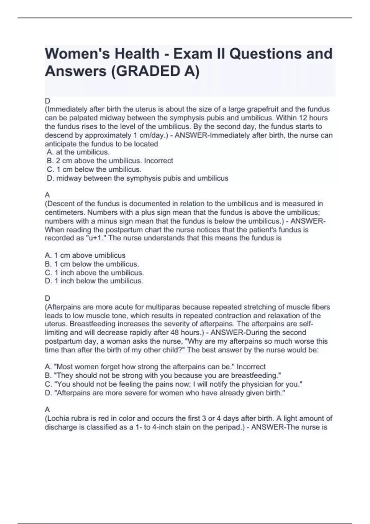 A (Descent of the fundus is documented in relation to the umbilicus and is measured in centimeters. Numbers with a plus sign mean that the fundus is above the umbilicus; numbers with a minus sign mean that the fundus is below the umbilicus.) - ANSWER-When reading the postpartum chart the nurse notices that the patient's fundus is recorded as "u+1." The nurse understands that this means the fundus is A. 1 cm above umiblicus B. 1 cm below the umbilicus. C. 1 inch above the umbilicus. D. 1 inch below the umbilicus. D (Afterpains are more acute for multiparas because repeated stretching of muscle fibers leads to low muscle tone, which results in repeated contraction and relaxation of the uterus. Breastfeeding increases the severity of afterpains. The afterpains are self-limiting and will decrease rapidly after 48 hours.) - ANSWER-During the second postpartum day, a woman asks the nurse, "Why are my afterpains so much worse this time than after the birth of my other child?" The best answer by the nurse would be: A. "Most women forget how strong the afterpains can be." Incorrect B. "They should not be strong with you because you are breastfeeding." C. "You should not be feeling the pains now; I will notify the physician for you." D. "Afterpains are more severe for women who have already given birth." A (Lochia rubra is red in color and occurs the first 3 or 4 days after birth. A light amount of discharge is classified as a 1- to 4-inch stain on the peripad.) - ANSWER-The nurse is