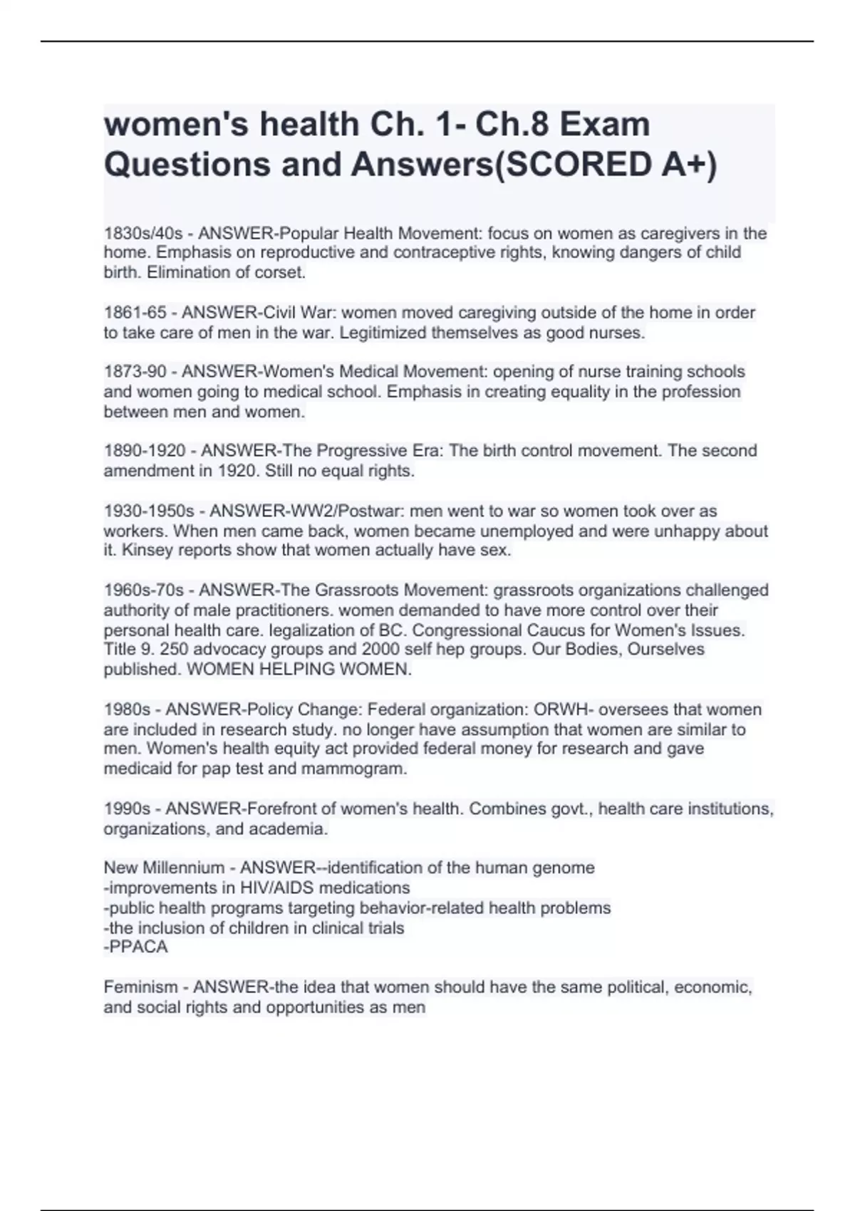 1861-65 - ANSWER-Civil War: women moved caregiving outside of the home in order to take care of men in the war. Legitimized themselves as good nurses. 1873-90 - ANSWER-Women's Medical Movement: opening of nurse training schools and women going to medical school. Emphasis in creating equality in the profession between men and women. - ANSWER-The Progressive Era: The birth control movement. The second amendment in 1920. Still no equal rights. s - ANSWER-WW2/Postwar: men went to war so women took over as workers. When men came back, women became unemployed and were unhappy about it. Kinsey reports show that women actually have sex. 1960s-70s - ANSWER-The Grassroots Movement: grassroots organizations challenged authority of male practitioners. women demanded to have more control over their personal health care. legalization of BC. Congressional Caucus for Women's Issues. Title 9. 250 advocacy groups and 2000 self hep groups. Our Bodies, Ourselves published. WOMEN HELPING WOMEN. 1980s - ANSWER-Policy Change: Federal organization: ORWH- oversees that women are included in research study. no longer have assumption that women are similar to men. Women's health equity act provided federal money for research and gave medicaid for pap test and mammogram. 1990s - ANSWER-Forefront of women's health. Combines govt., health care institutions, organizations, and academia. New Millennium - ANSWER--identification of the human genome -improvements in HIV/AIDS medications -public health programs targeting behavior-related health problems -the inclusion of children in clinical trials -PPACA Feminism - ANSWER-the idea that women should have the same political, economic, and social rights and opportunities as men
