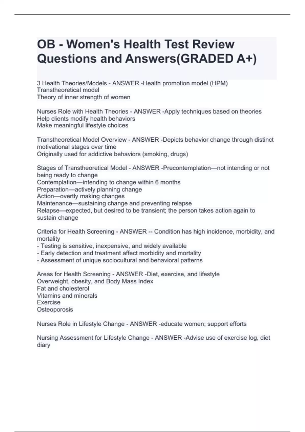 Nurses Role with Health Theories - ANSWER -Apply techniques based on theories Help clients modify health behaviors Make meaningful lifestyle choices Transtheoretical Model Overview - ANSWER -Depicts behavior change through distinct motivational stages over time Originally used for addictive behaviors (smoking, drugs) Stages of Transtheoretical Model - ANSWER -Precontemplation—not intending or not being ready to change Contemplation—intending to change within 6 months Preparation—actively planning change Action—overtly making changes Maintenance—sustaining change and preventing relapse Relapse—expected, but desired to be transient; the person takes action again to sustain change Criteria for Health Screening - ANSWER -- Condition has high incidence, morbidity, and mortality - Testing is sensitive, inexpensive, and widely available - Early detection and treatment affect morbidity and mortality - Assessment of unique sociocultural and behavioral patterns Areas for Health Screening - ANSWER -Diet, exercise, and lifestyle Overweight, obesity, and Body Mass Index Fat and cholesterol Vitamins and minerals Exercise Osteoporosis Nurses Role in Lifestyle Change - ANSWER -educate women; support efforts Nursing Assessment for Lifestyle Change - ANSWER -Advise use of exercise log, diet diary