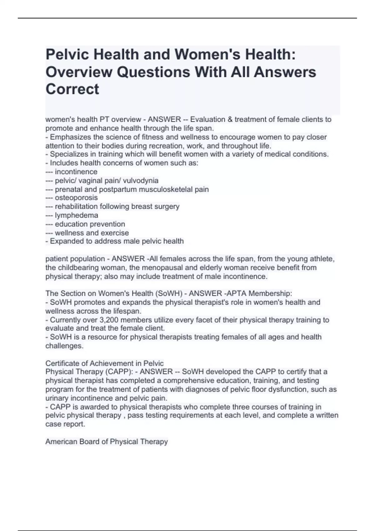 The Section on Women's Health (SoWH) - ANSWER -APTA Membership: - SoWH promotes and expands the physical therapist's role in women's health and wellness across the lifespan. - Currently over 3,200 members utilize every facet of their physical therapy training to evaluate and treat the female client. - SoWH is a resource for physical therapists treating females of all ages and health challenges. Certificate of Achievement in Pelvic Physical Therapy (CAPP): - ANSWER -- SoWH developed the CAPP to certify that a physical therapist has completed a comprehensive education, training, and testing program for the treatment of patients with diagnoses of pelvic floor dysfunction, such as urinary incontinence and pelvic pain. - CAPP is awarded to physical therapists who complete three courses of training in pelvic physical therapy , pass testing requirements at each level, and complete a written case report. American Board of Physical Therapy