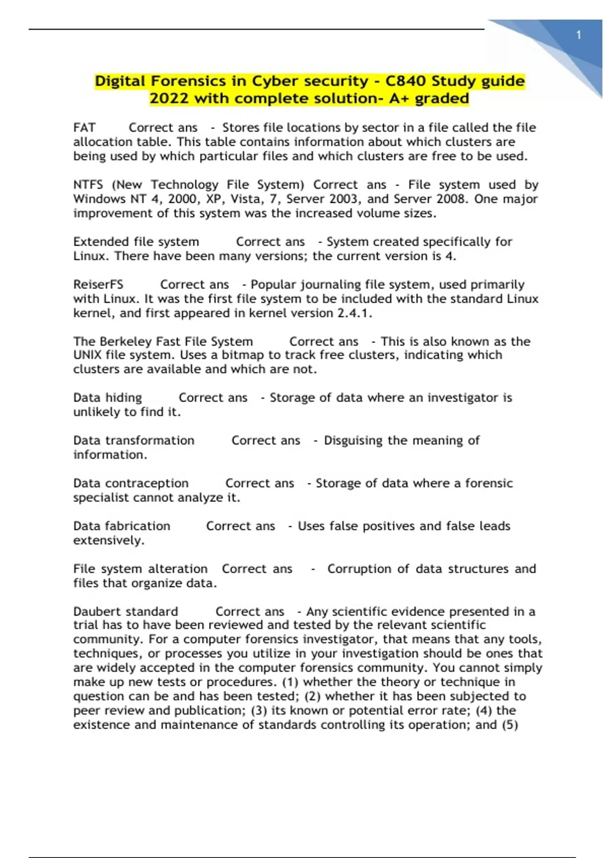 Digital Forensics in Cyber security - C840 Study guide 2022 with complete solution- A+ graded/Digital Forensics in Cyber security - C840 Study guide 2022 with complete solution- A+ graded/Digital Forensics in Cyber security - C840 Study guide 2022 with complete solution- A+ graded/Digital Forensics in Cyber security - C840 Study guide 2022 with complete solution- A+ graded/Digital Forensics in Cyber security - C840 Study guide 2022 with complete solution- A+ graded