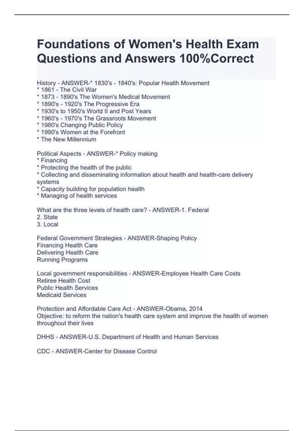 * 1861 - The Civil War * 's The Women's Medical Movement * 1890's - 1920's The Progressive Era * 1930's to 1950's World II and Post Years * 1960's - 1970's The Grassroots Movement * 1980's Changing Public Policy * 1990's Women at the Forefront * The New Millennium Political Aspects - ANSWER-* Policy making * Financing * Protecting the health of the public * Collecting and disseminating information about health and health-care delivery systems * Capacity building for population health * Managing of health services What are the three levels of health care? - ANSWER-1. Federal 2. State 3. Local Federal Government Strategies - ANSWER-Shaping Policy Financing Health Care Delivering Health Care Running Programs Local government responsibilities - ANSWER-Employee Health Care Costs Retiree Health Cost Public Health Services Medicaid Services Protection and Affordable Care Act - ANSWER-Obama, 2014 Objective: to reform the nation's health care system and improve the health of women throughout their lives DHHS - ANSWER-U.S. Department of Health and Human Services CDC - ANSWER-Center for Disease Control