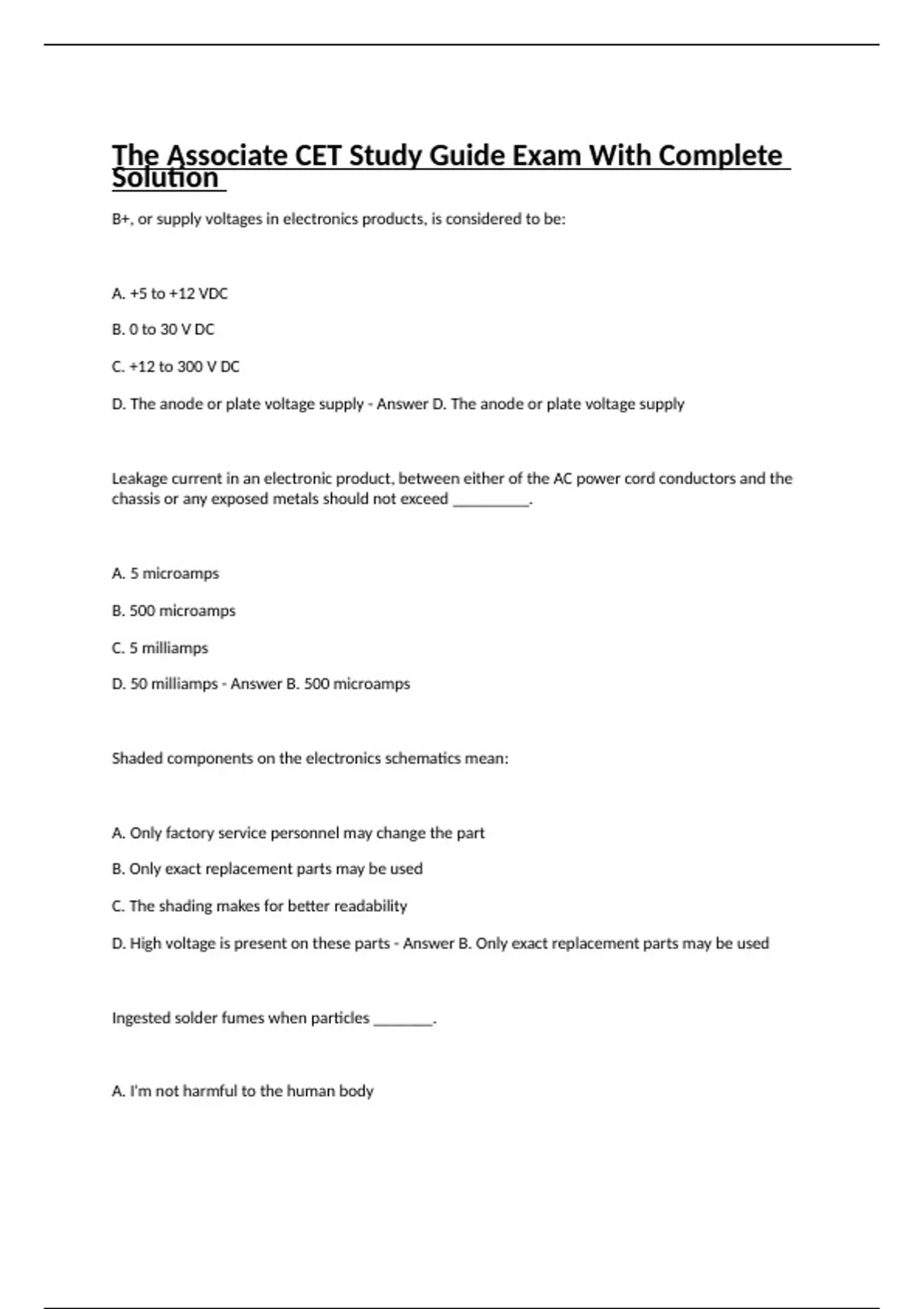 B+, or supply voltages in electronics products, is considered to be: A. +5 to +12 VDC B. 0 to 30 V DC C. +12 to 300 V DC D. The anode or plate voltage supply - Answer D. The anode or plate voltage supply Leakage current in an electronic product, between either of the AC power cord conductors and the chassis or any exposed metals should not exceed _________. A. 5 microamps B. 500 microamps C. 5 milliamps D. 50 milliamps - Answer B. 500 microamps Shaded components on the electronics schematics mean: A. Only factory service personnel may change the part B. Only exact replacement parts may be used C. The shading makes for better readability D. High voltage is present on these parts - Answer B. Only exact replacement parts may be used Ingested solder fumes when particles _______. A. I'm not harmful to the human body B. Are toxic C. From lead-tin solder aren't harmful D. From tin-alloys are most harmful - Answer B. Are toxic Second degree skin burns should ________. A. Not be treated with ice and bandage pack B. Be covered with thick bandages C. Be treated with cold water or ice D. Be treated by draining blisters - Answer A. Not be treated with ice and bandage pack Rules describing the fire or toxicity retardant types of cabling which may be installed in buildings is contained in _________. A. NEC Article 770 B. UL 569B C. TIA/EIA standard 578 D. NEMA code 1316 - Answer A. NEC Article 770 ESD and static discharge is most destructive to _______. A. CMOS semiconductors B. TTL semiconductors C. Germanium PN junctions D. Silicon PN junctions - Answer A. CMOS semiconductors If you have never receive formal training and practice CPR want a pricing or dummy, in the event of finding a fellow worker not breathing, you _________. A. Should use what knowledge you do half of the procedure and attempt it B. Should not attempt it, but call for help C. Should attempt it after calling for help D. Should, if handy, read the instructions and attempt in order to save the life - Answer B. Should not attempt it, but call for help When working at heights above 6 feet, a ________ is required by OSHA rules. A. Linesman's belt B. Linesman's belt attached to a lanyard C. Full body harness attached to a lanyard that prevents more than a 6 foot drop D. Good insurance policy - Answer C. Full body harness attached to a lanyard that prevents more than a 6 foot drop 'Phantom' current is associated with ________. A. Northern Lights B. Corona arcing from electrical generators C. Charge retained by inductors D. Charge retained by capacitors - Answer D. Charge retained by capacitors The atomic number of an element is the same as the element's atomic weight. A. True B. False - Answer B. False An increase in the voltage with resistance held constant causes current to __________. A. Decrease B. Increase twice to value of voltage C. Increase D. None of the above - Answer C. Increase The ampere, expresses __________. A. Volts/sec increase B. A unit of charge movement per second past a given point C. Coulombs/charge D. An increase in resistance - Answer B. A unit of charge movement per second past a given point The total resistance of a parallel circuit containing equal branch resistances is found by the following: A. By adding all of the branch resistance values B. By taking the product of all the branch resistance values C. By dividing the resistance value of a branch by the number of branches D. The value cannot be found - Answer C. By dividing the resistance value of a branch by the number of branches A 12 V DC power supply has a 15 ohm internal resistance. What load resistance can you be connected to transfer maximum power? A. 15 ohms B. 20 ohms C. 10 ohms D. 5 ohms - Answer A. 15 ohms Maximum power transfer occurs when the low impedance is equal to the source impedance. A. True B. False - Answer A. True What will happen to the current through the resistor if the resistor value increases? A. Current increases B. Current remains unchanged C. Current decreases D. Car and the voltage across the resistor increases - Answer C. Current decreases Which type of circuit has the same voltage across each component? A. Parallel B. Series-parallel C. Series D. Combination - Answer A. Parallel Total power in a series circuit is determined by the: A. Source voltage times the current B. Total voltage applied to the circuit C. Current flowing through the switch D. Average wattage rating of each resistor - Answer A. Source voltage times the current Which is the equivalent to 100 microamps? A. .1 milliamps B. 1 milliamps C. 10 milliamps D. 10 Nanoamps - Answer A. .1 milliamps A resistor __________. A. Stores an electric charge B. Is measured in coulombs C. In a circuit causes a voltage drop from one end to the other D. Is dependent on lines of force - Answer C. In a circuit causes a voltage drop from one end to the other 1 kΩ is the same as __________. A. 1 thousand ohms B. 1 thousandth of an ohm C. 10−² ohms D. 10000 ohms - Answer A. 1 thousand ohms A circuit has one 500 ohm resistor in series with three 500 ohm resistors that are connected in parallel with each other. The total resistance would be ____________. A. 666 ohms B. 167.7 ohms C. 750 ohms D. 1000 ohms - Answer A. 666 ohms The voltage rating of a capacitor ___________. A. Must be factored into the resistance formula B. Relates to the maximum voltage that should be applied to it C. Indicates the maximum current the capacitor can allow D. Is the same as the power factor - Answer B. Relates to the maximum voltage that should be applied to it Calculating the total capacitance of several capacitors connected in parallel __________. A. Is not necessary as they are not used this way B. Causes a need to consider inductance factors C. Is done by adding each of the capacitance values D. Is the same as the power factor - Answer C. Is done by adding each of the capacitance values Ferrite __________. A. Is a capacitor dielectric B. Is a common inductor core material C. Is the most common resistor