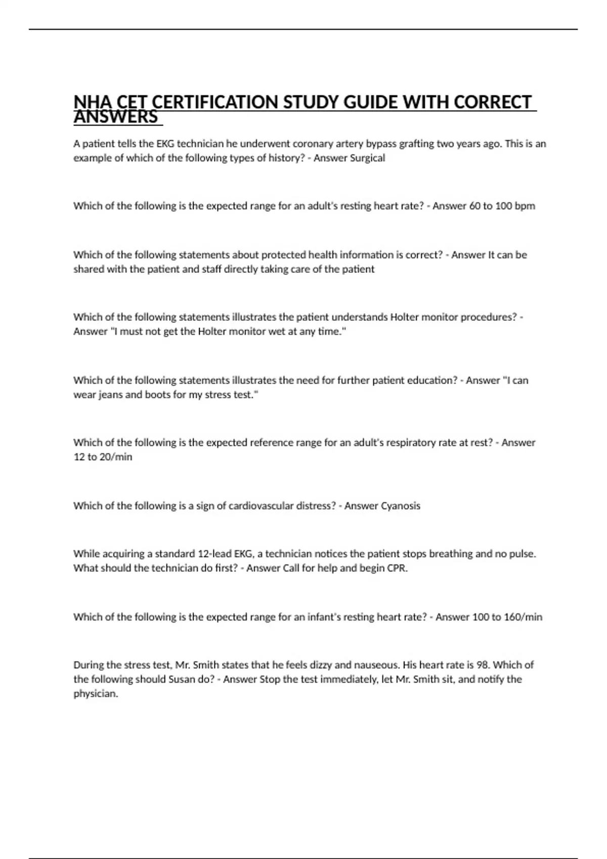 A patient tells the EKG technician he underwent coronary artery bypass grafting two years ago. This is an example of which of the following types of history? - Answer Surgical Which of the following is the expected range for an adult's resting heart rate? - Answer 60 to 100 bpm Which of the following statements about protected health information is correct? - Answer It can be shared with the patient and staff directly taking care of the patient Which of the following statements illustrates the patient understands Holter monitor procedures? - Answer "I must not get the Holter monitor wet at any time." Which of the following statements illustrates the need for further patient education? - Answer "I can wear jeans and boots for my stress test." Which of the following is the expected reference range for an adult's respiratory rate at rest? - Answer 12 to 20/min Which of the following is a sign of cardiovascular distress? - Answer Cyanosis While acquiring a standard 12-lead EKG, a technician notices the patient stops breathing and no pulse. What should the technician do first? - Answer Call for help and begin CPR. Which of the following is the expected range for an infant's resting heart rate? - Answer 100 to 160/min During the stress test, Mr. Smith states that he feels dizzy and nauseous. His heart rate is 98. Which of the following should Susan do? - Answer Stop the test immediately, let Mr. Smith sit, and notify the physician. Mr. Smith is taking Metoprolol for hypertension. Which of the following is a common side effect of this beta-blocker? - Answer Hypotension Which of the following statements by the EKG Technician correctly describes how the patient should prepare for the stress test? - Answer "Wear comfortable clothes and shoes for the test."