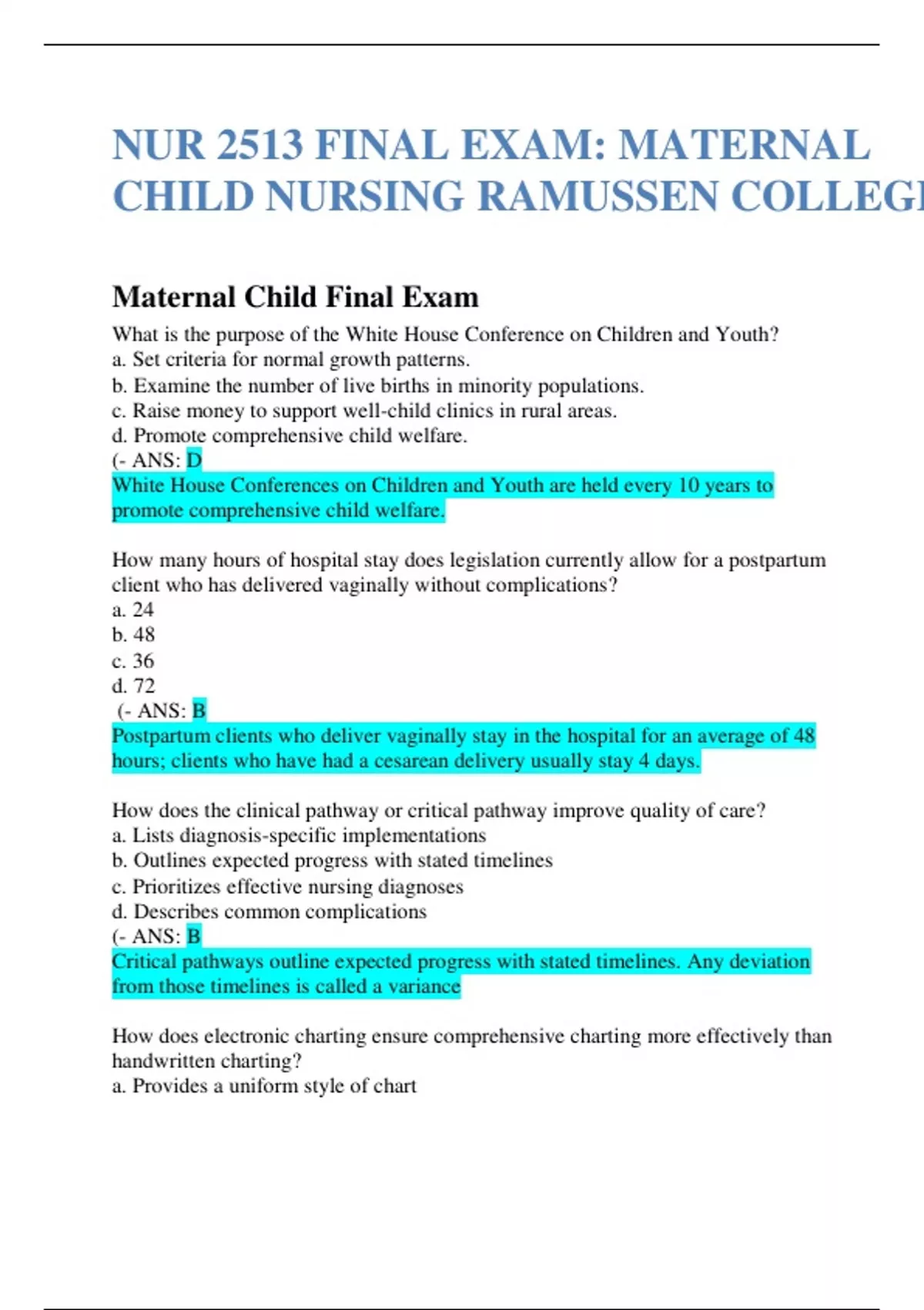 NUR 2513 FINAL EXAM MATERNAL CHILD NURSING RAMUSSEN COLLEGE.