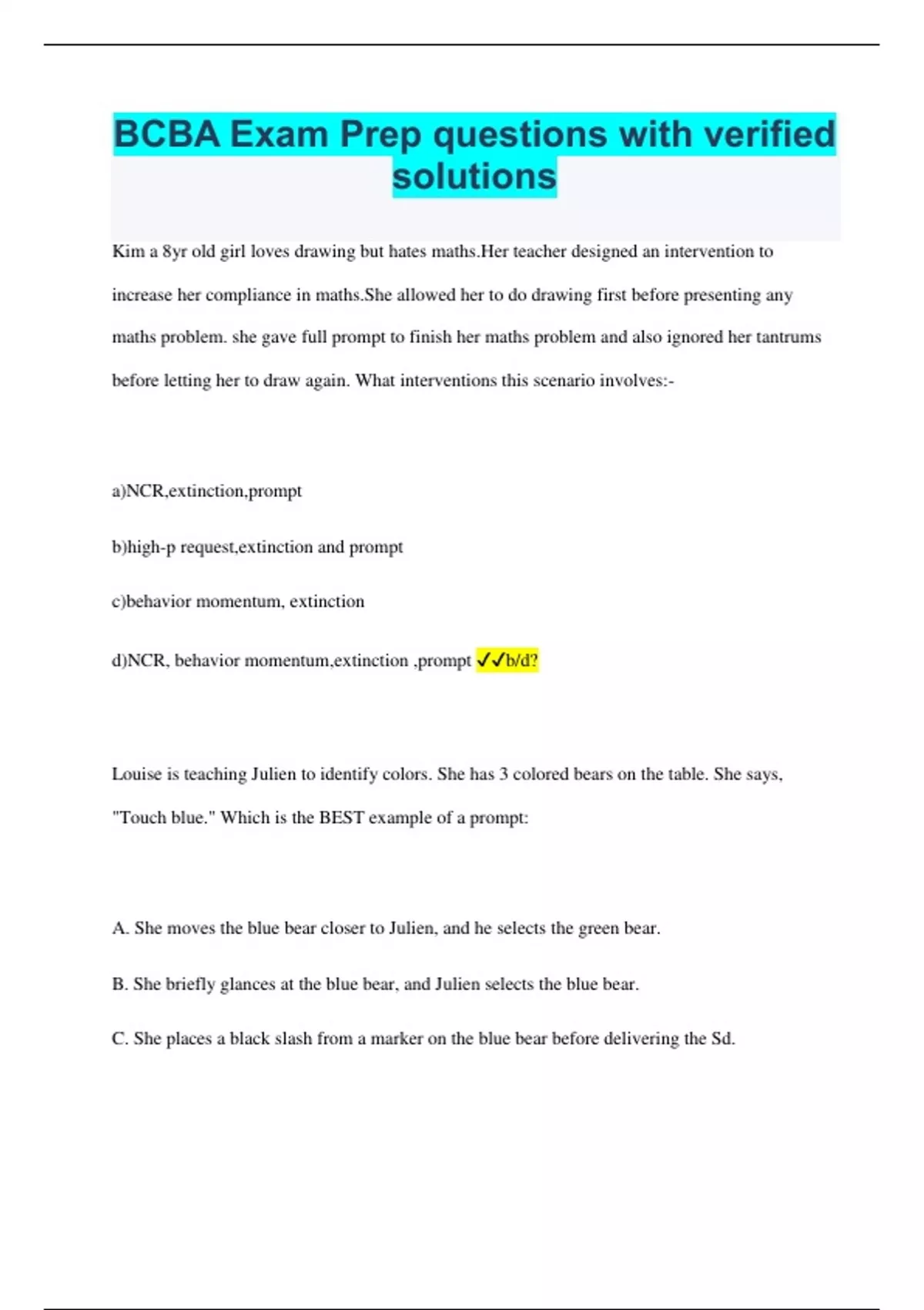 Kim a 8yr old girl loves drawing but hates maths.Her teacher designed an intervention to increase her compliance in maths.She allowed her to do drawing first before presenting any maths problem. she gave full prompt to finish her maths problem and also ignored her tantrums before letting her to draw again. What interventions this scenario involves:- a)NCR,extinction,prompt b)high-p request,extinction and prompt c)behavior momentum, extinction d)NCR, behavior momentum,extinction ,prompt b/d? Louise is teaching Julien to identify colors. She has 3 colored bears on the table. She says, "Touch blue." Which is the BEST example of a prompt: A. She moves the blue bear closer to Julien, and he selects the green bear. B. She briefly glances at the blue bear, and Julien selects the blue bear. C. She places a black slash from a marker on the blue bear before delivering the Sd.