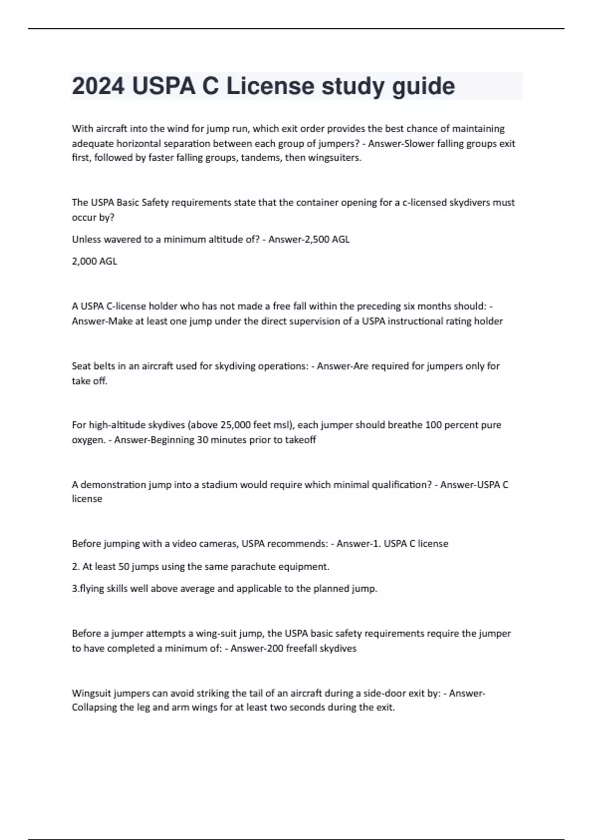 With aircraft into the wind for jump run, which exit order provides the best chance of maintaining adequate horizontal separation between each group of jumpers? - Answer-Slower falling groups exit first, followed by faster falling groups, tandems, then wingsuiters. The USPA Basic Safety requirements state that the container opening for a c-licensed skydivers must occur by? Unless wavered to a minimum altitude of? - Answer-2,500 AGL 2,000 AGL A USPA C-license holder who has not made a free fall within the preceding six months should: - Answer-Make at least one jump under the direct supervision of a USPA instructional rating holder Seat belts in an aircraft used for skydiving operations: - Answer-Are required for jumpers only for take off. For high-altitude skydives (above 25,000 feet msl), each jumper should breathe 100 percent pure oxygen. - Answer-Beginning 30 minutes prior to takeoff A demonstration jump into a stadium would require which minimal qualification? - Answer-USPA C license Before jumping with a video cameras, USPA recommends: - Answer-1. USPA C license 2. At least 50 jumps using the same parachute equipment. g skills well above average and applicable to the planned jump. Before a jumper attempts a wing-suit jump, the USPA basic safety requirements require the jumper to have completed a minimum of: - Answer-200 freefall skydives Wingsuit jumpers can avoid striking the tail of an aircraft during a side-door exit by: - AnswerCollapsing the leg and arm wings for at least two seconds during the exit.When choosing to jump a smaller canopy, jumpers should be familiar with (on their previous canopy): - Answer-1. Flaring for landing from slow flight 2. consistent soft, stand-up landings within 10 meters of a planned target in a variety of wind conditions. 3. Beginning to flare, turning to 10 degree bank, and returning to a level wing before landing. According to SIM section 6-10 , any parachute smaller than 150 square feet: - Answer-Is considered advanced regardless of wing loading. Jumpers should expect to encounter turbulence while under canopy: - Answer-1. Downwind and behind running aircraft 2. Behind and above other parachutes in flight. 3. Downwind of buildings, trees and other tall ground obstructions. Before attempting any advanced landing maneuvers under canopy, each jumper should: - AnswerPractice the maneuver above 2,500 feet AGL Recommend deployment altitude for beginning wing-Suit jumpers is: - Answer-4,000 feet AGL Under what conditions may objects be dropped from an aircraft with the pilots approval? - Answer-If precautions are taken to avoid injury or damage to persons or property