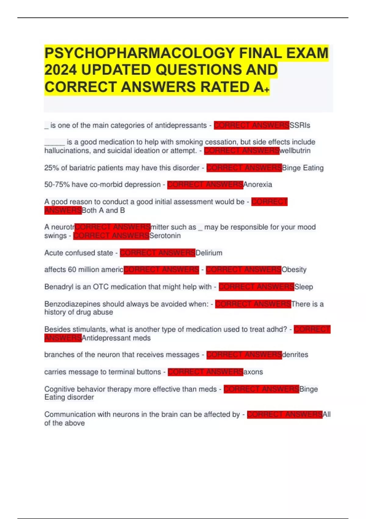 PSYCHOPHARMACOLOGY FINAL EXAM 2024 UPDATED QUESTIONS AND CORRECT ANSWERS RATED A+,PSYCHOPHARMACOLOGY FINAL EXAM 2024 UPDATED QUESTIONS AND CORRECT ANSWERS RATED A+,PSYCHOPHARMACOLOGY FINAL EXAM 2024 UPDATED QUESTIONS AND CORRECT ANSWERS RATED A+