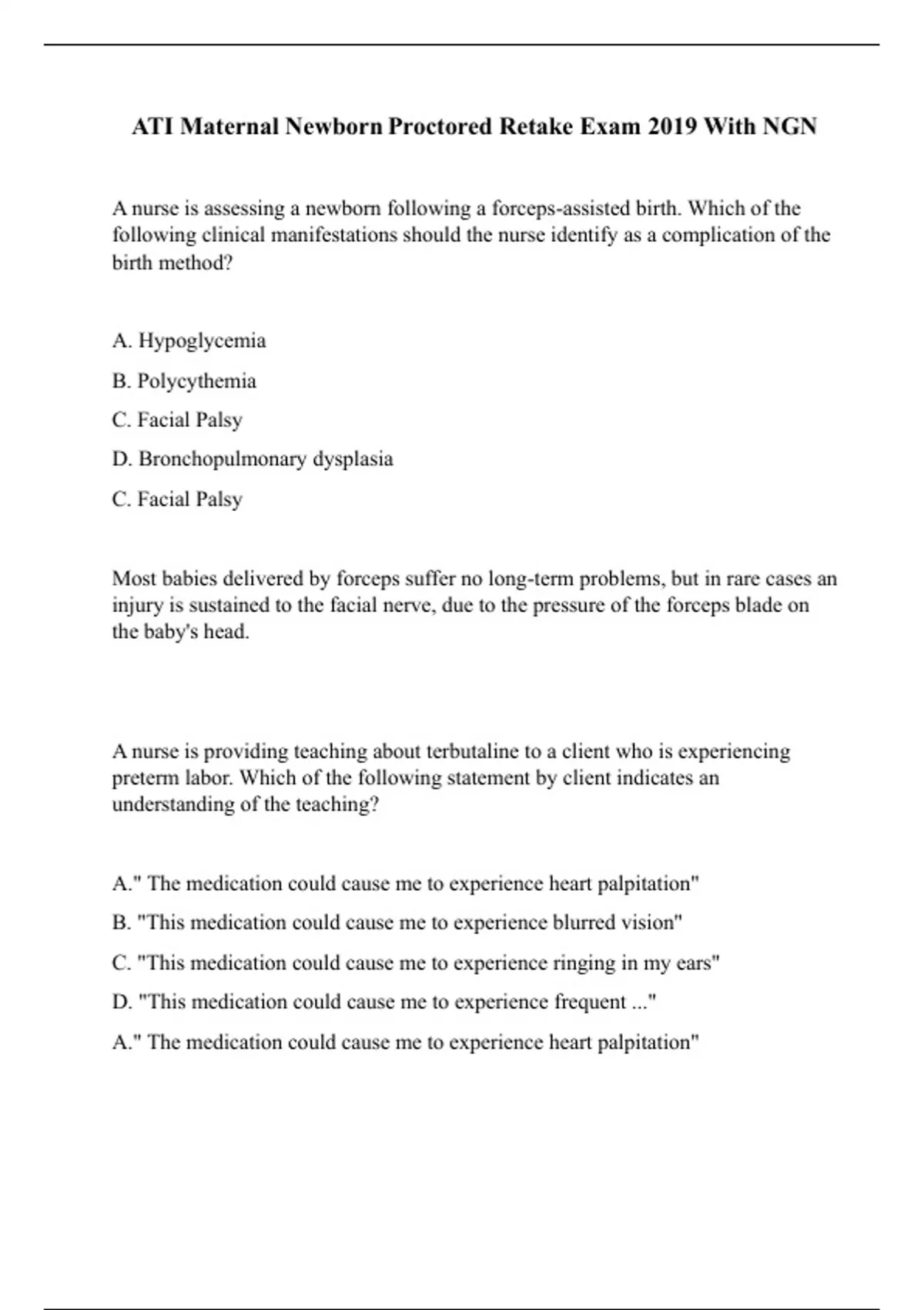 A nurse is assessing a newborn following a forceps-assisted birth. Which of the following clinical manifestations should the nurse identify as a complication of the birth method? A. Hypoglycemia B. Polycythemia C. Facial Palsy D. Bronchopulmonary dysplasia C. Facial Palsy Most babies delivered by forceps suffer no long-term problems, but in rare cases an injury is sustained to the facial nerve, due to the pressure of the forceps blade on the baby's head. A nurse is providing teaching about terbutaline to a client who is experiencing preterm labor. Which of the following statement by client indicates an understanding of the teaching? A." The medication could cause me to experience heart palpitation" B. "This medication could cause me to experience blurred vision" C. "This medication could cause me to experience ringing in my ears" D. "This medication could cause me to experience frequent ..." A." The medication could cause me to experience heart palpitation" This is a serious side effect of terbutaline and must be notifies to the physician immediately A nurse is caring for a client who has hyperemesis gravidarum. Which of the following laboratory tests should the nurse anticipate? A . Urine Ketones B. Rapid plasma regain C.Prothrombin time D.Urine culture Urine Ketones Hyperemesis gravidarum is a severe form of this 'morning sickness', experience by less than 1% of pregnant women. It can cause dehydration and starvation and the production of compounds called ketones that can be found in the blood and urine. A nurse is caring for a client who is in labor and requests nonpharmacological pain management. Which of the following nursing actions promotes client comfort? A. Assisting the client into squatting position B. Having the client lie in a supine position C. Applying fundal pressure during contractions D. Encouraging the client to void every 6 hr Having the client lie in a supine position Having the patient lie in a comfortable position may help reduce sensation of pain due to labor A nurse caring for a client who is at 20 weeks of gestation and has trichomoniasis. Which of the following findings should the nurse expect? A. Thick, White Vaginal Discharge B. Urinary Frequency C. Vulva Lesions D. Malodorous Discharge Malodorous Discharge A nurse is caring for a client who is 14 weeks of gestation. At which the following locations should the nurse place the Doppler device when assessing the fetal heart rate? A . Midline 2 to 3 cm (0.8 to 1.2 in) above the symphysis pubis B. Left Upper Abdomen C. Two fingerbreadths above the umbilicus D. Lateral at the Xiphoid Process Midline 2 to 3 cm (0.8 to 1.2 in) above the symphysis pubis at 14 weeks AOG this is where to place the doppler probe to note FHT
