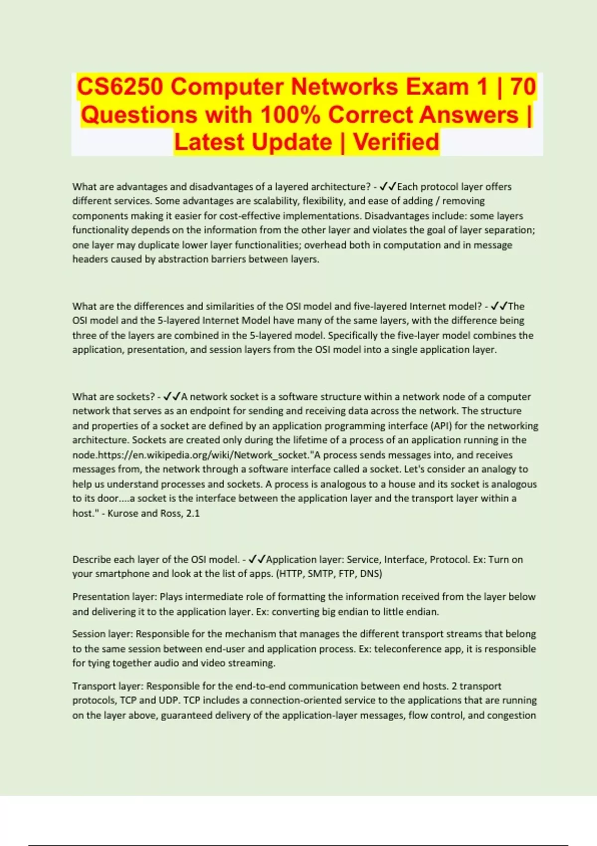 What are advantages and disadvantages of a layered architecture? - Each protocol layer offers different services. Some advantages are scalability, flexibility, and ease of adding / removing components making it easier for cost-effective implementations. Disadvantages include: some layers functionality depends on the information from the other layer and violates the goal of layer separation; one layer may duplicate lower layer functionalities; overhead both in computation and in message headers caused by abstraction barriers between layers. What are the differences and similarities of the OSI model and five-layered Internet model? - The OSI model and the 5-layered Internet Model have many of the same layers, with the difference being three of the layers are combined in the 5-layered model. Specifically the five-layer model combines the application, presentation, and session layers from the OSI model into a single application layer. What are sockets? - A network socket is a software structure within a network node of a computer network that serves as an endpoint for sending and receiving data across the network. The structure and properties of a socket are defined by an application programming interface (API) for the networking architecture. Sockets are created only during the lifetime of a process of an application running in the :// messages from, the network through a software interface called a socket. Let's consider an analogy to help us understand processes and sockets. A process is analogous to a house and its socket is analogous to its door....a socket is the interface between the application layer and the transport layer within a host." - Kurose and Ross, 2.1